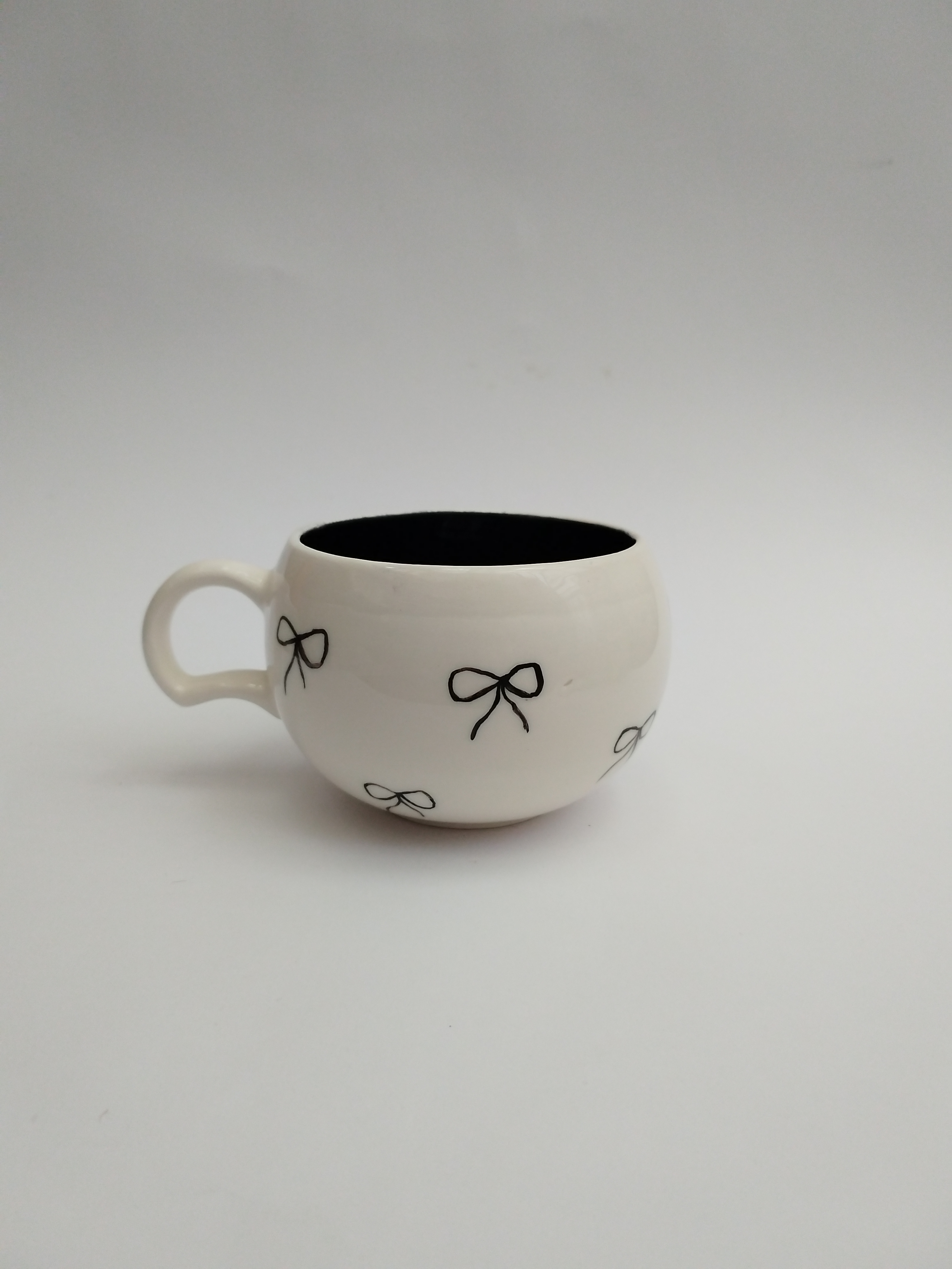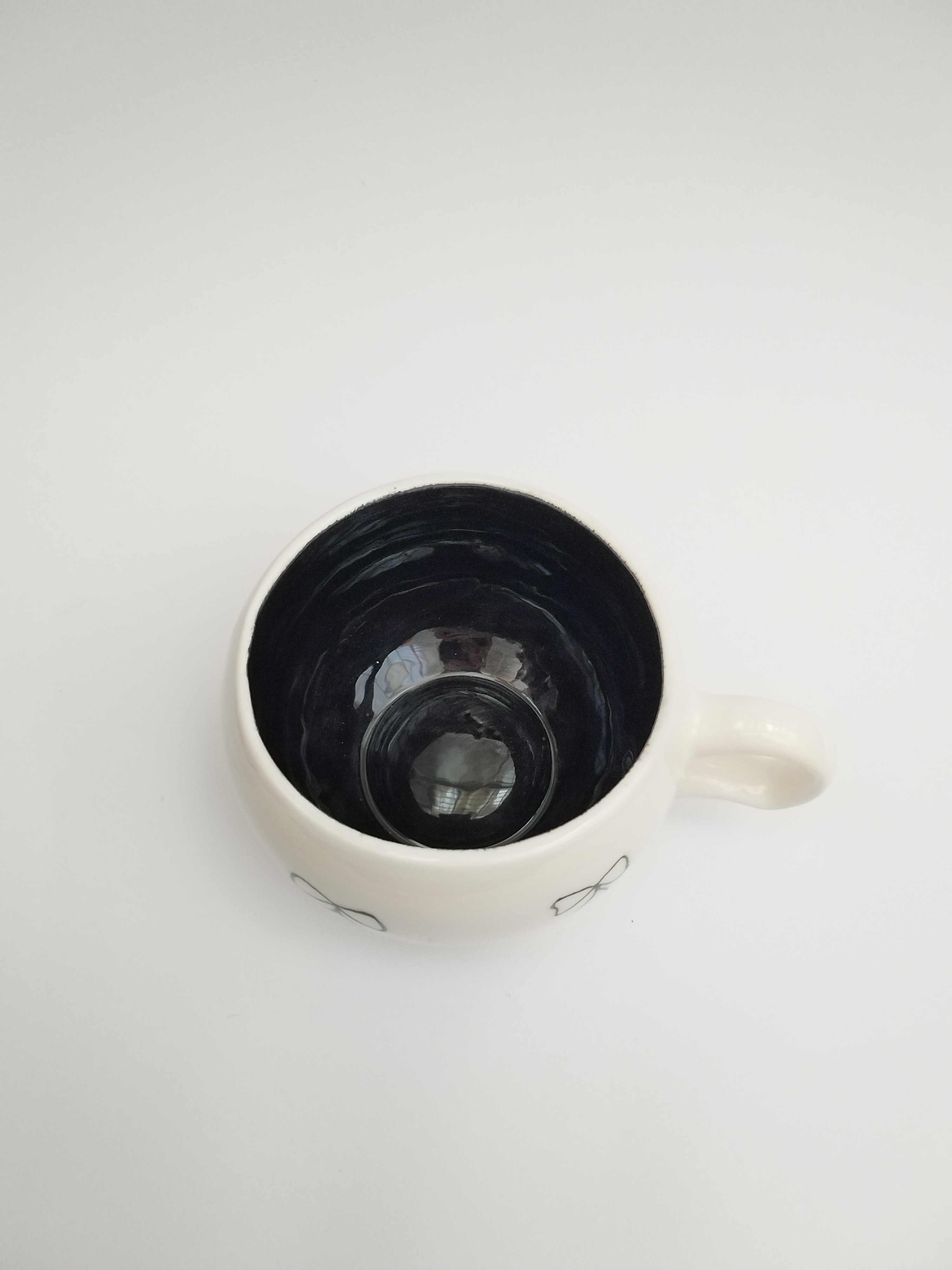 رنگ داخل ماگ مشکی براق و روی ماگ پاپیون های مشکی نقاشی شده است.