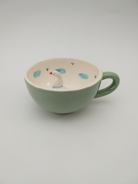 این ماگ زیبا و خلاقانه از جنس سرامیک باکیفیت ساخته شده و طراحی منحصربهفرد آن شامل یک فیگور غاز سهبعدی در داخل ماگ است که هنگام نوشیدن، شما را غافلگیر میکند. رنگ سبز دلنشین بیرون ماگ همراه با نقاشی دستی ابر آبی در داخل ماگ، حس شادی و لطافت را القا میکند.