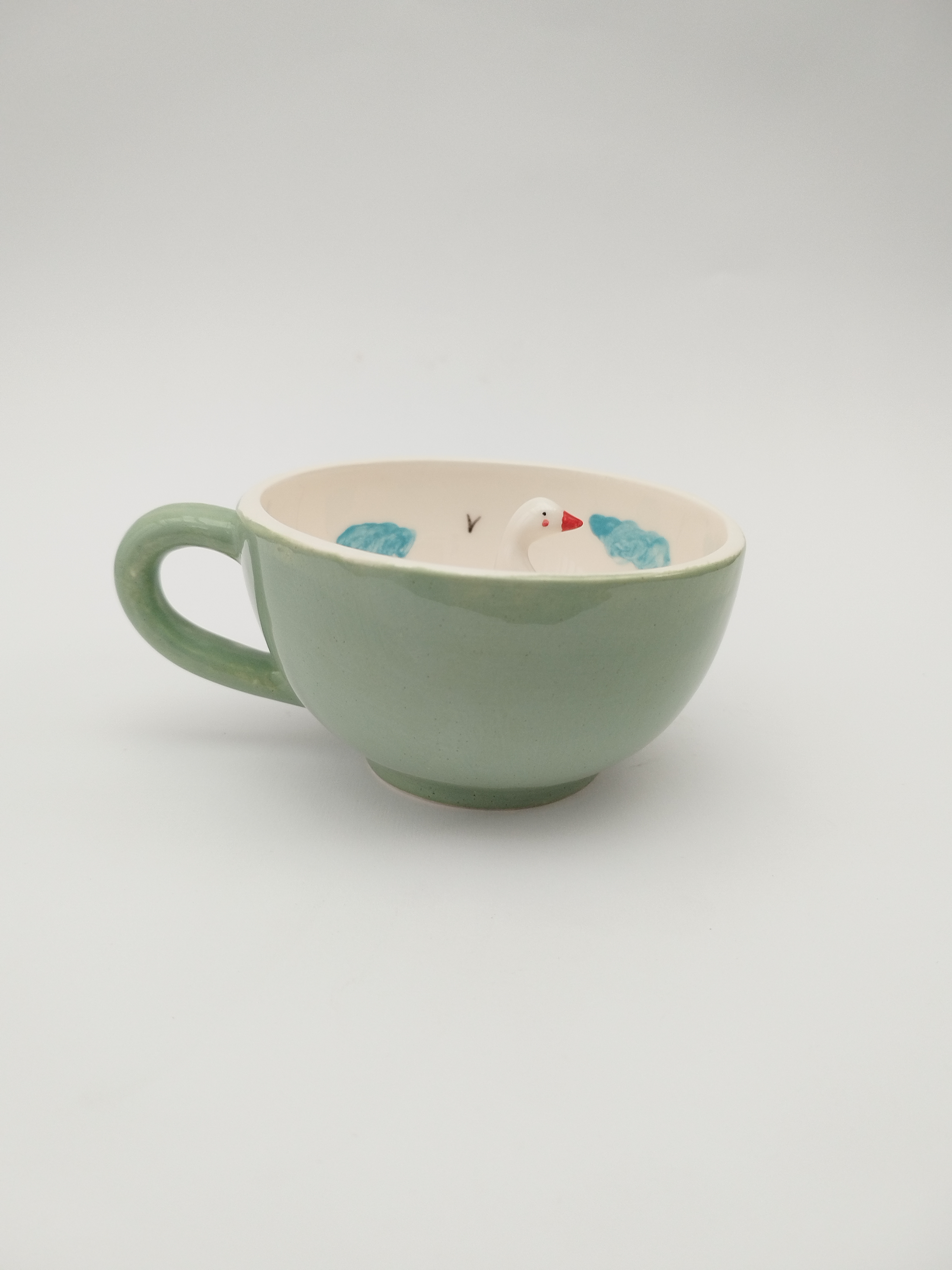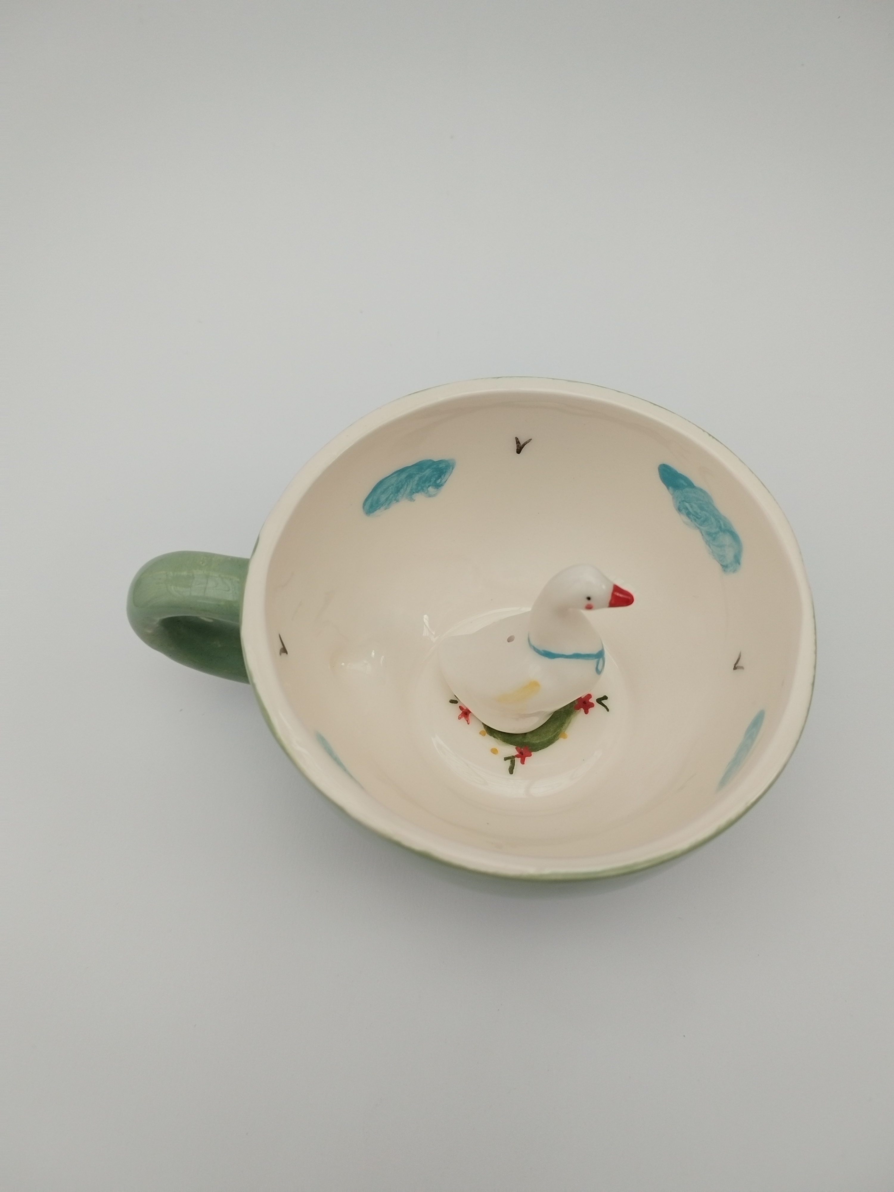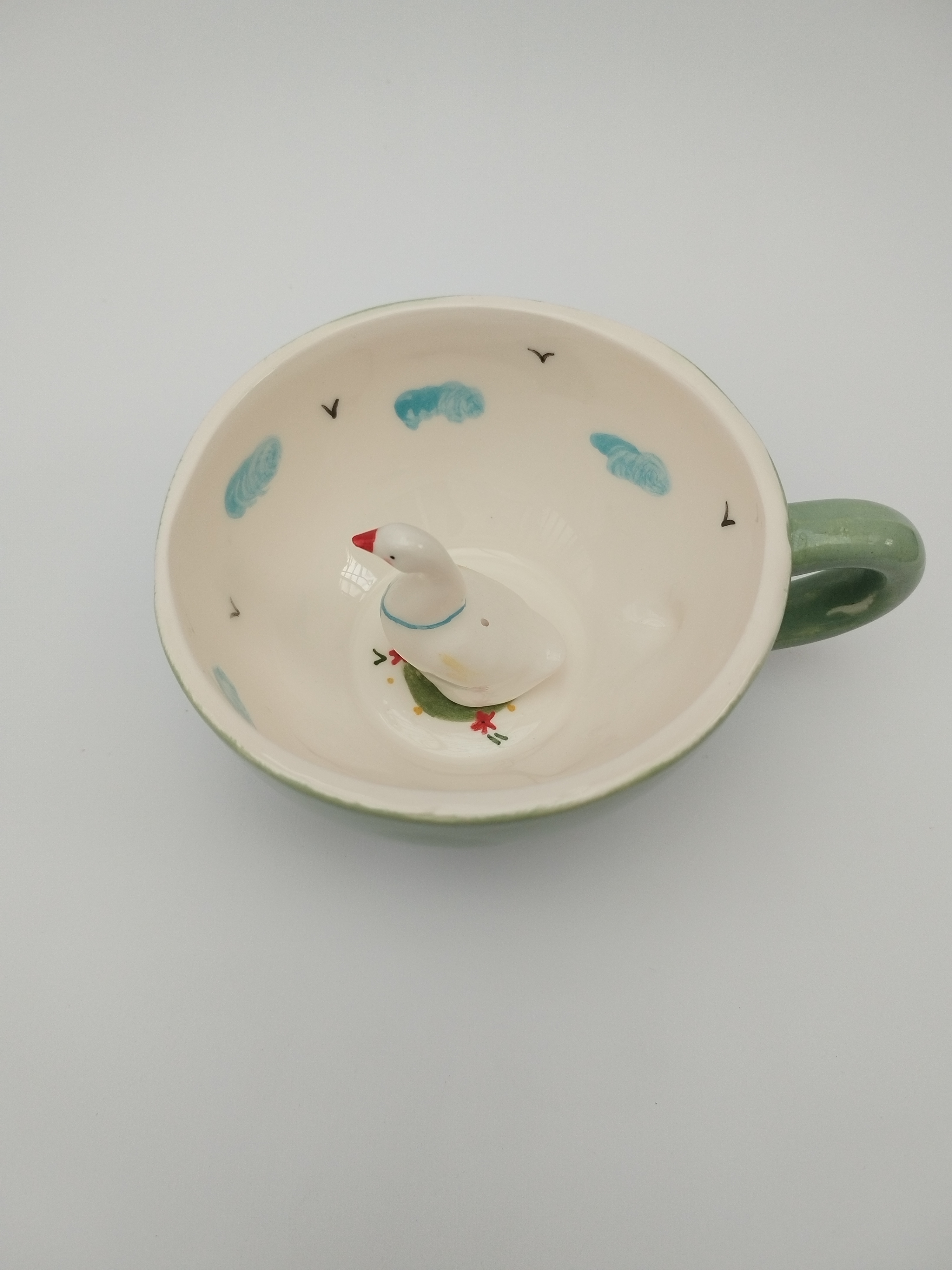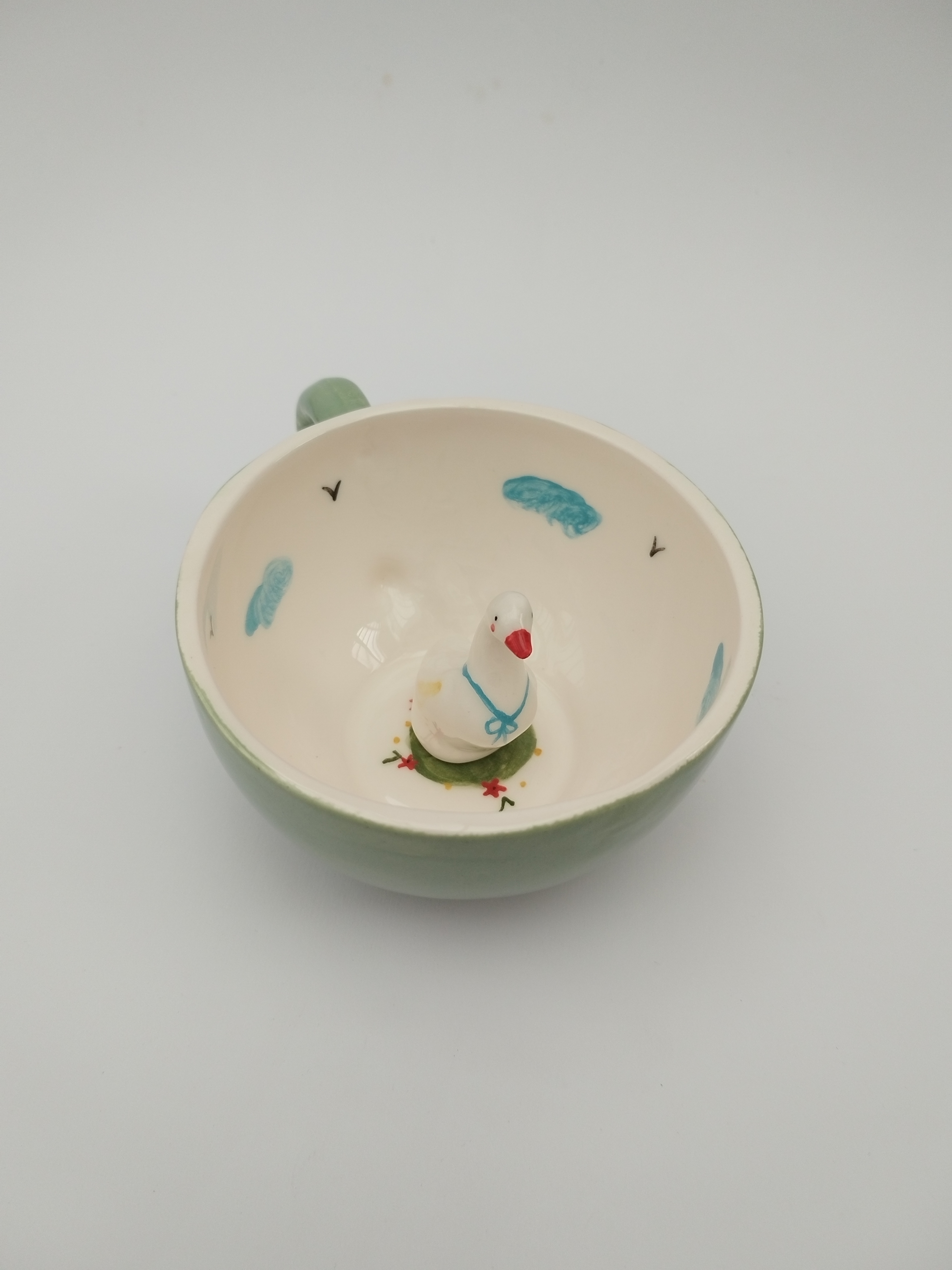 این ماگ زیبا و خلاقانه از جنس سرامیک باکیفیت ساخته شده و طراحی منحصربهفرد آن شامل یک فیگور غاز سهبعدی در داخل ماگ است که هنگام نوشیدن، شما را غافلگیر میکند. رنگ سبز دلنشین بیرون ماگ همراه با نقاشی دستی ابر آبی در داخل ماگ، حس شادی و لطافت را القا میکند.