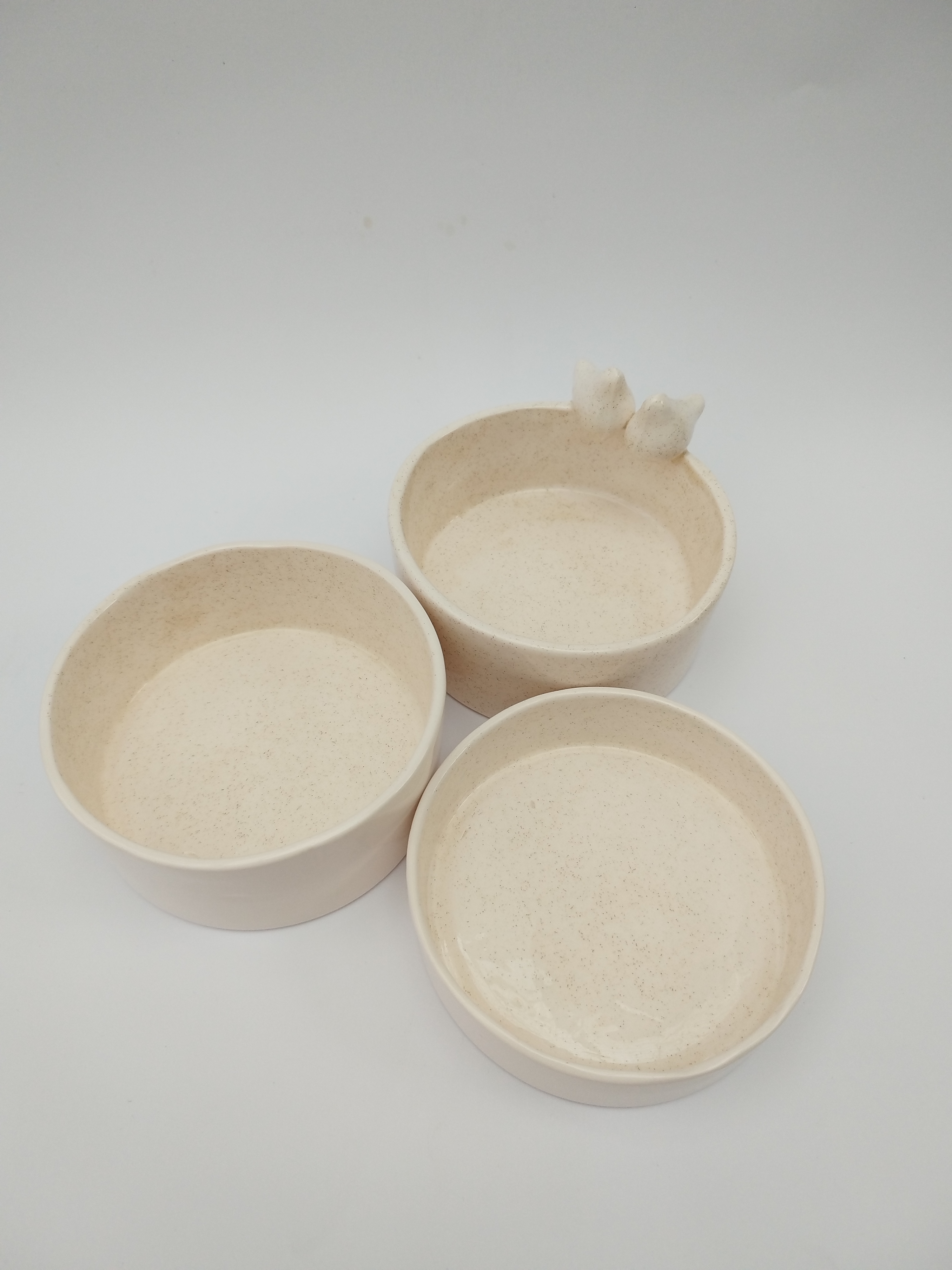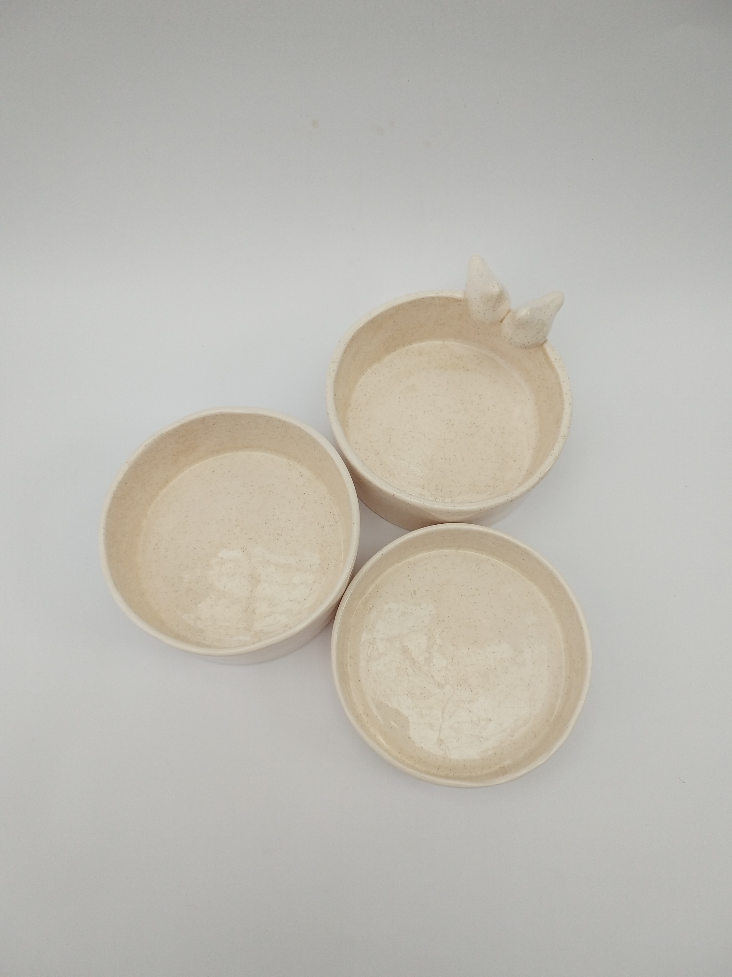این ست زیبا شامل 3 عدد ظرف جداگانه قطر 10 سانتی متر با ارتفاع های متقاوت که لبه یکی از ظروف دو عدد پرنده نشسته اند.