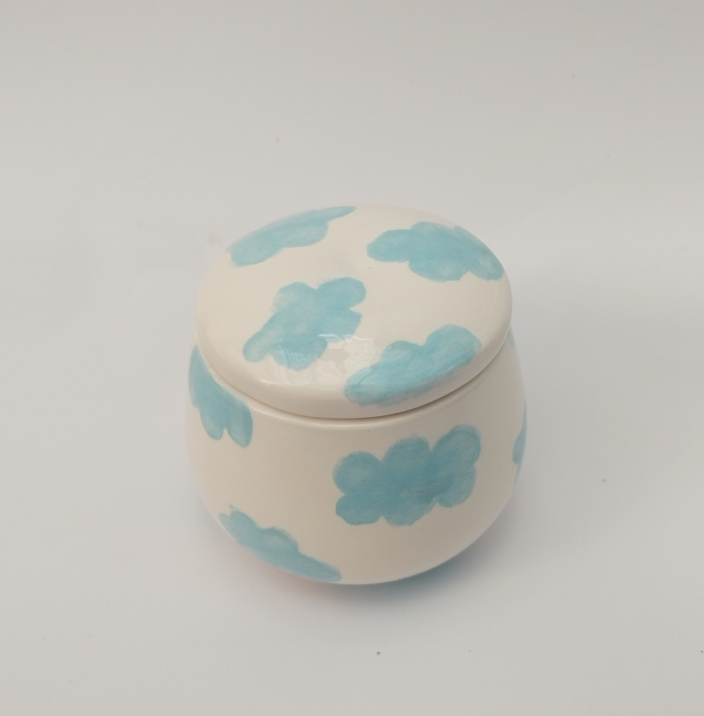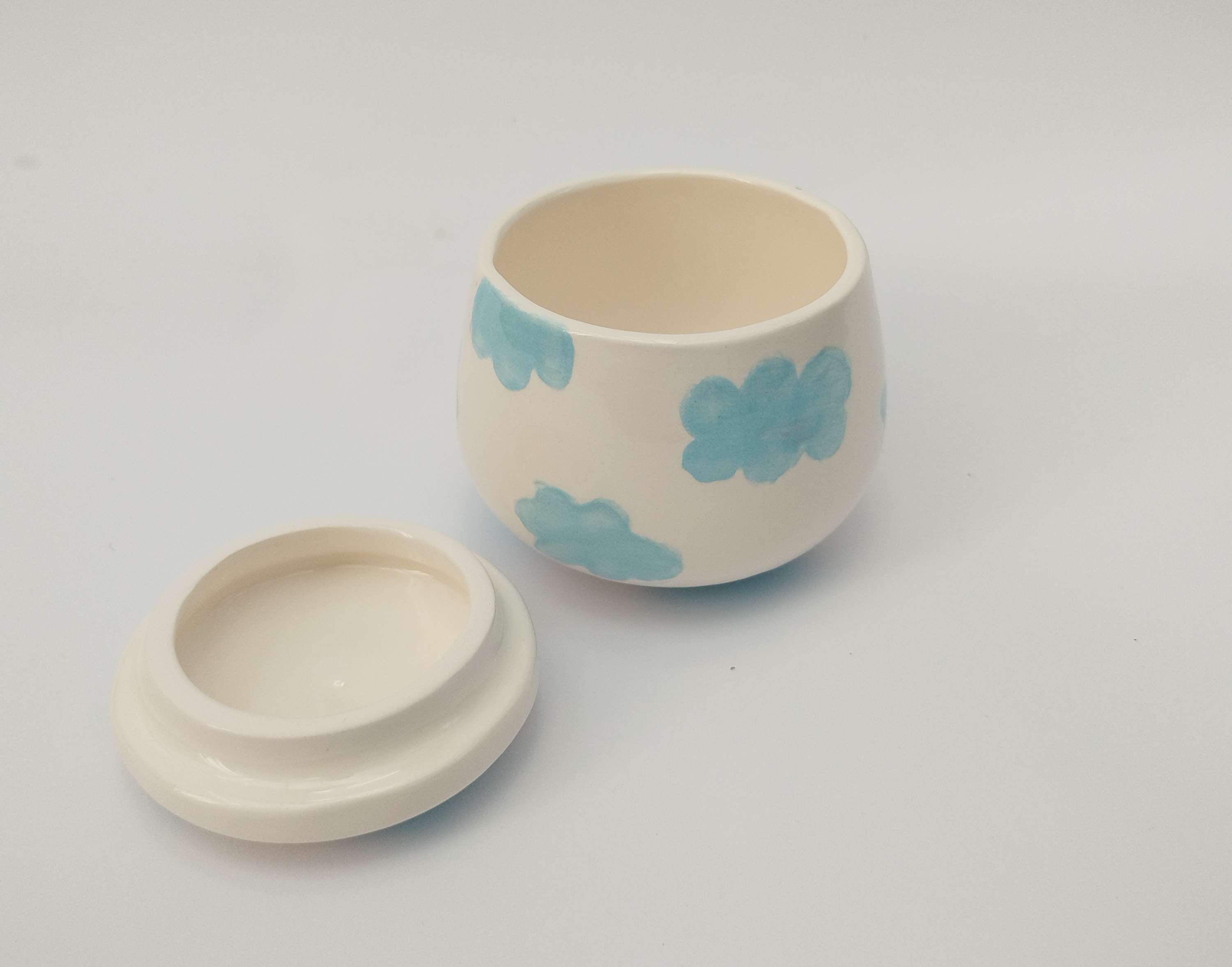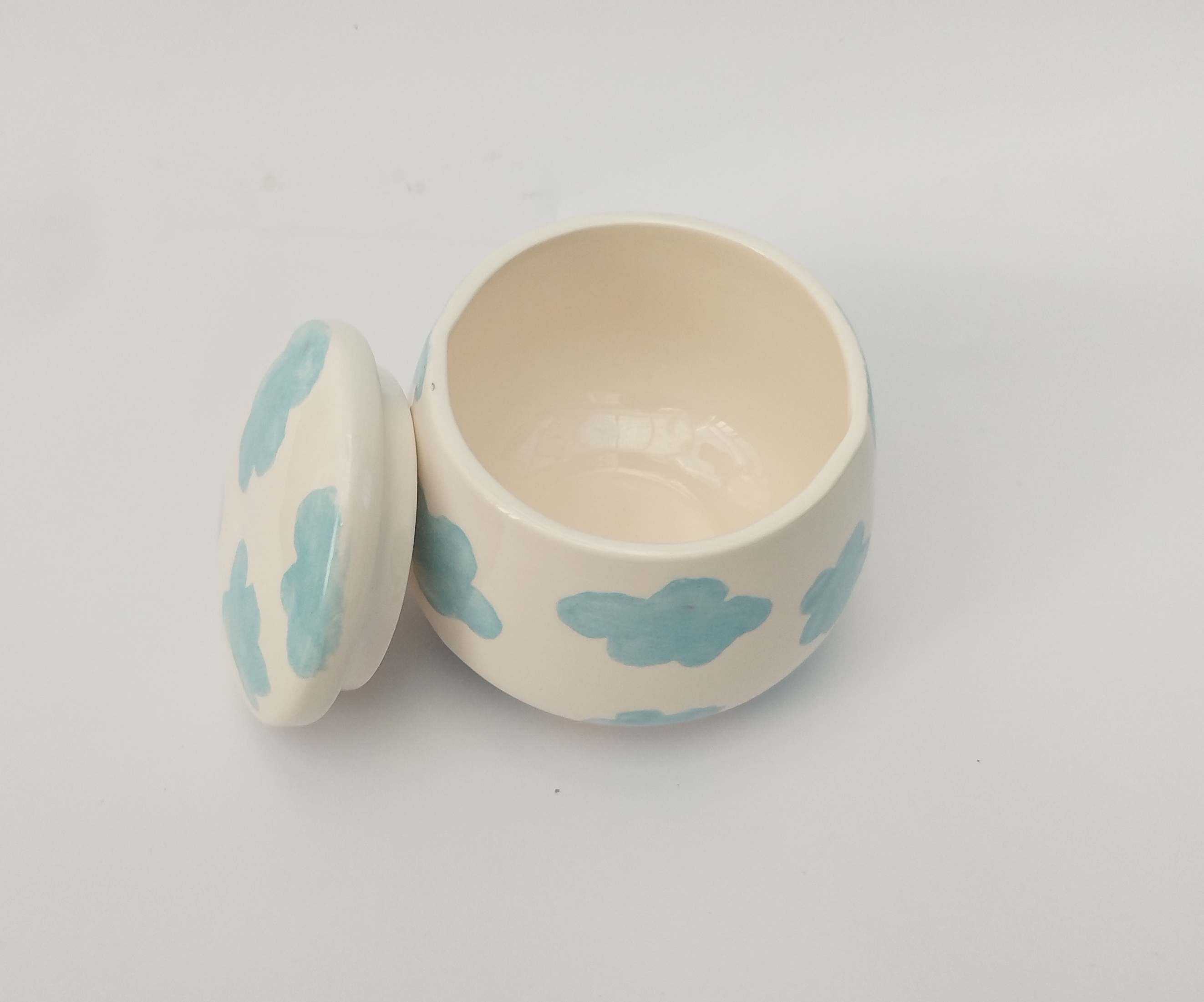 قندان سرامیکی دست ساز همراه با درب، طرح ابر های آبی آسمانی، یک هدیه خاص و شیک و فانتزی برای خودتان یا عزیزانتان میباشد