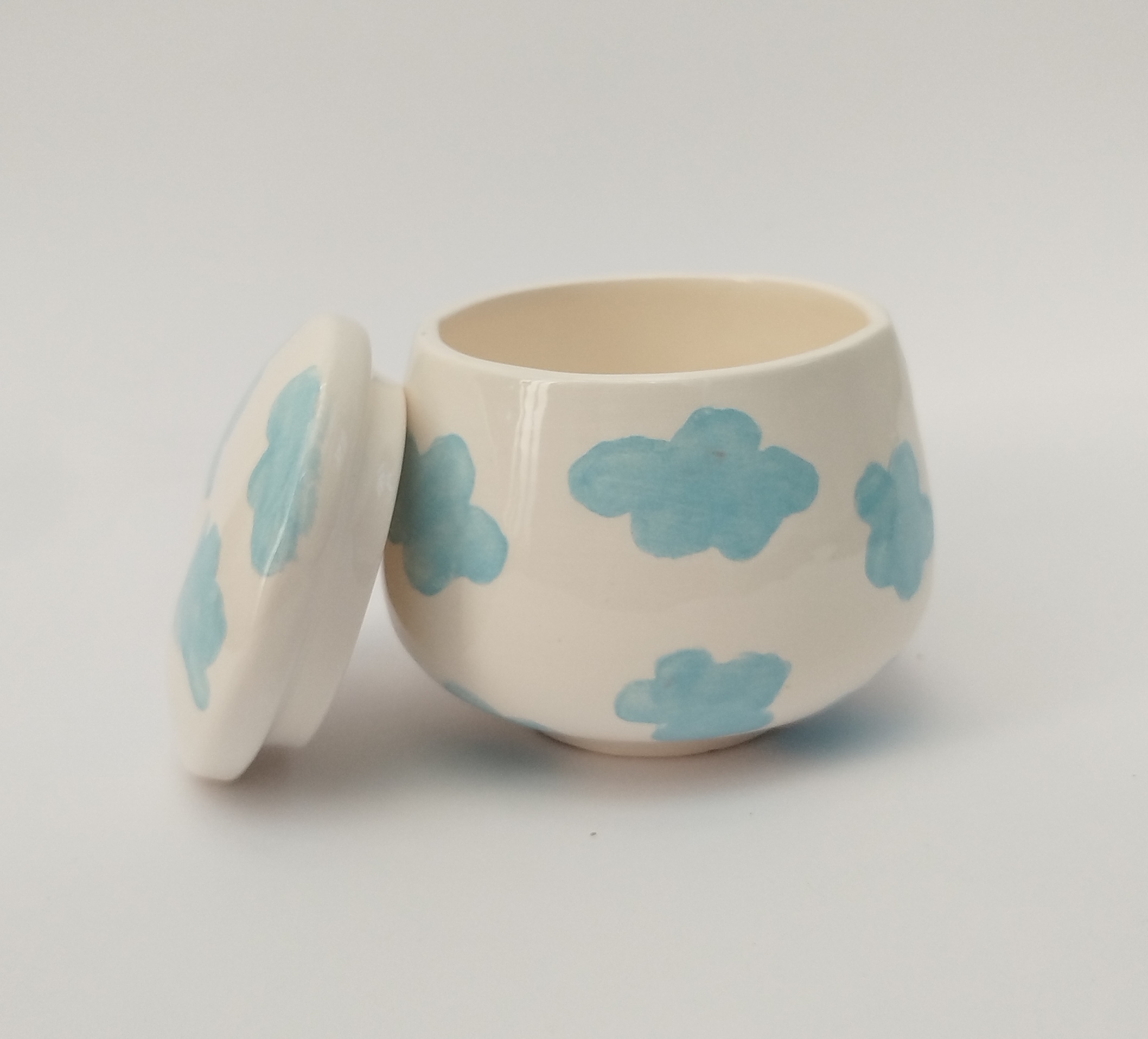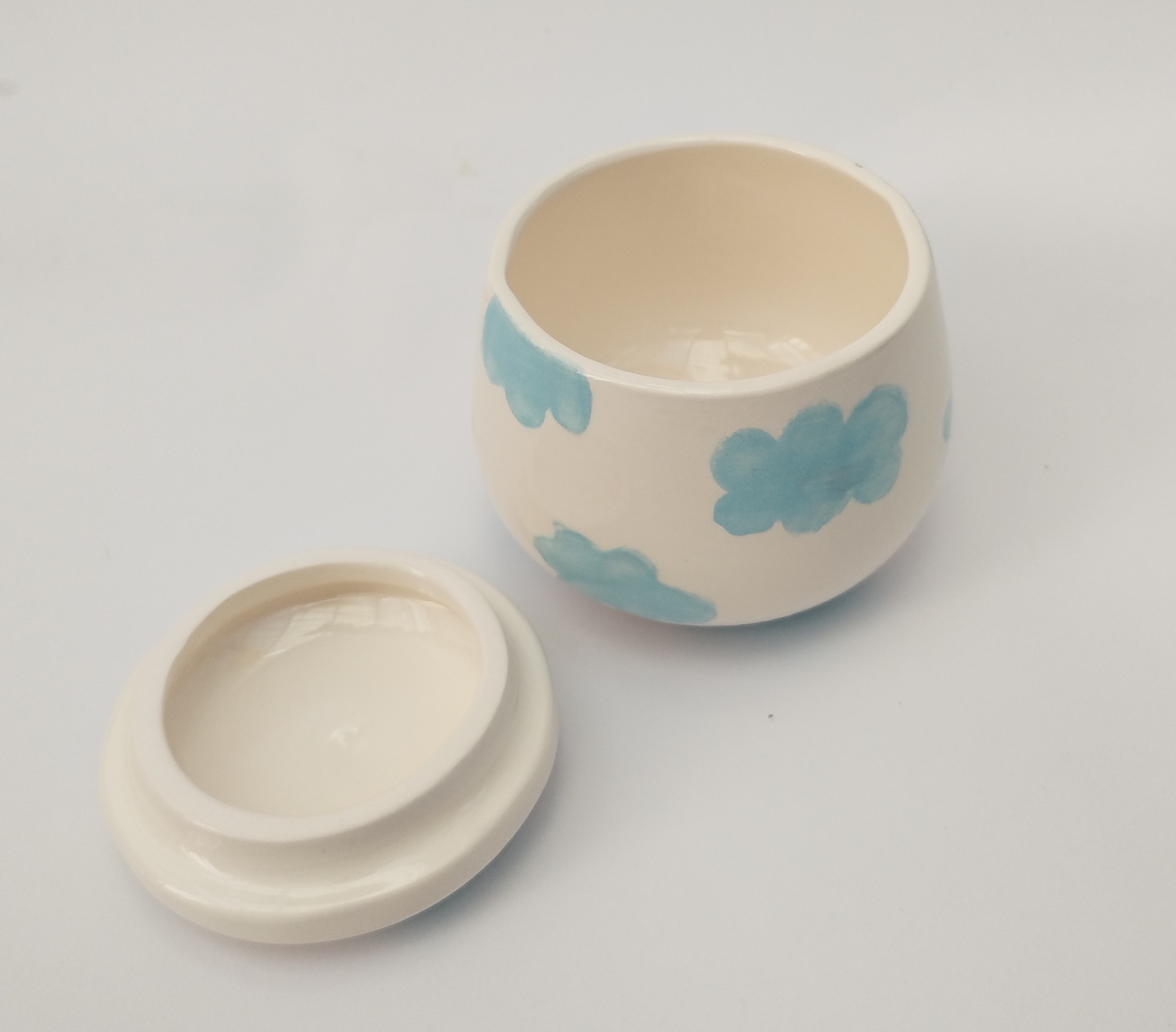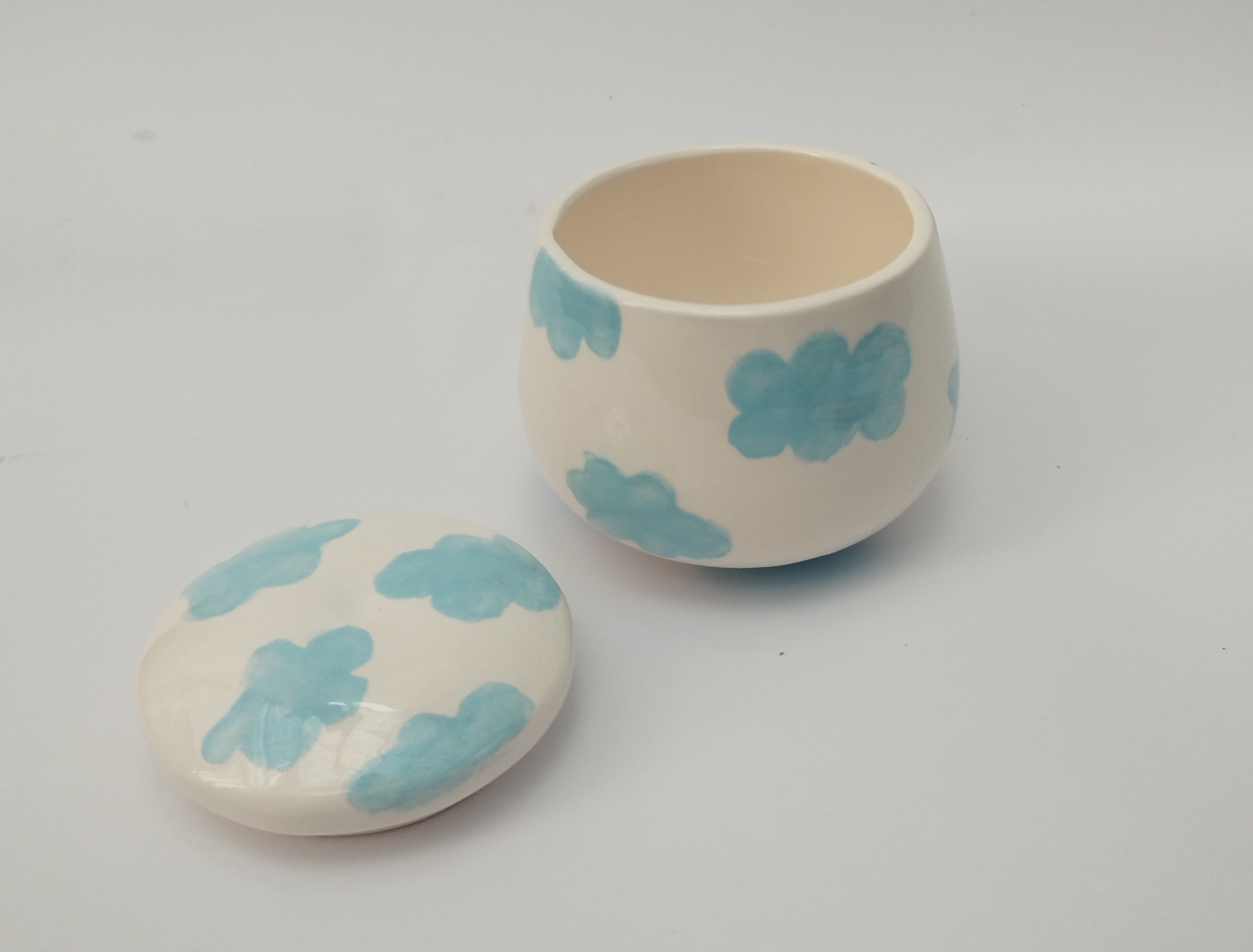 قندان سرامیکی دست ساز همراه با درب، طرح ابر های آبی آسمانی، یک هدیه خاص و شیک و فانتزی برای خودتان یا عزیزانتان میباشد
