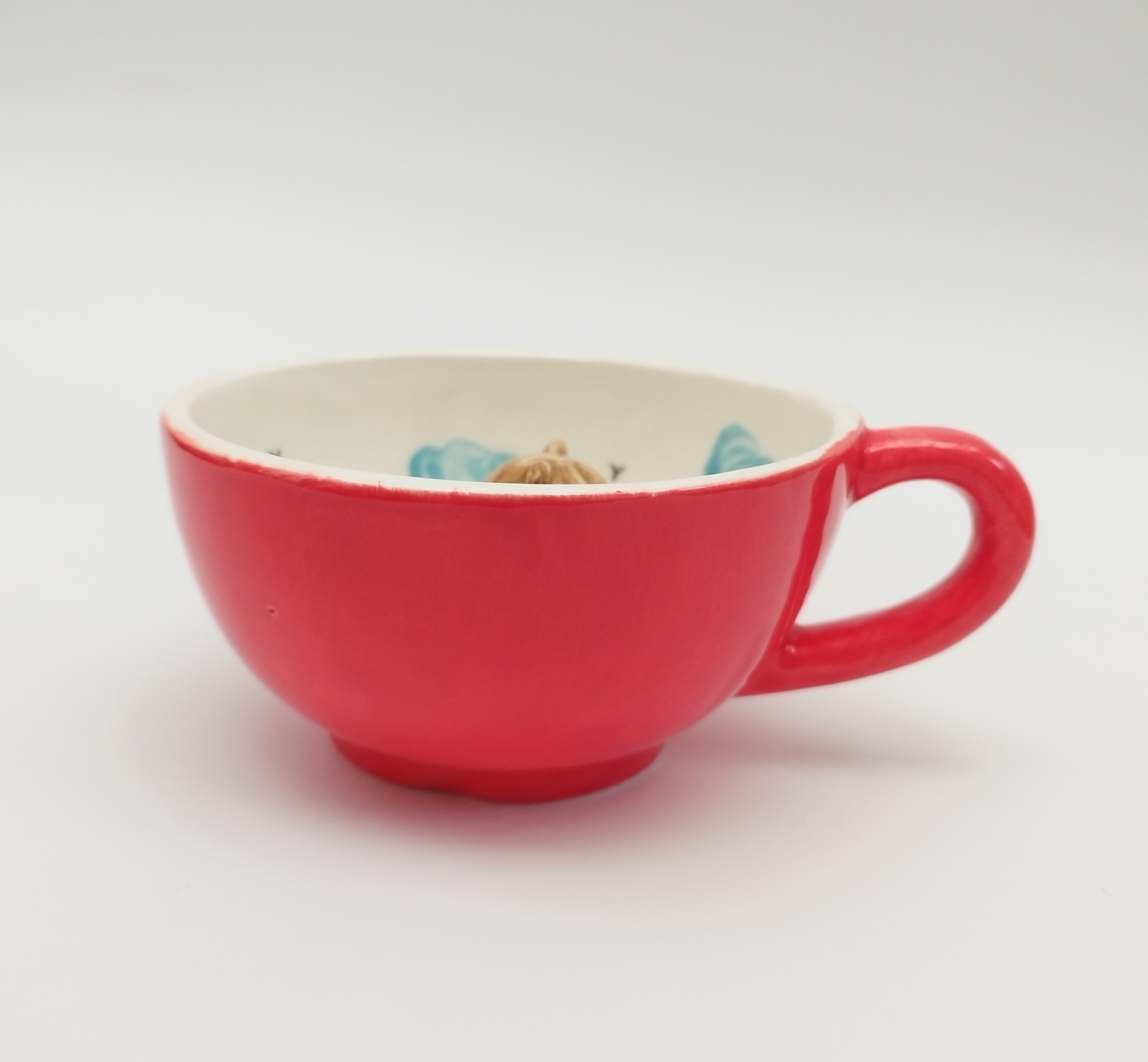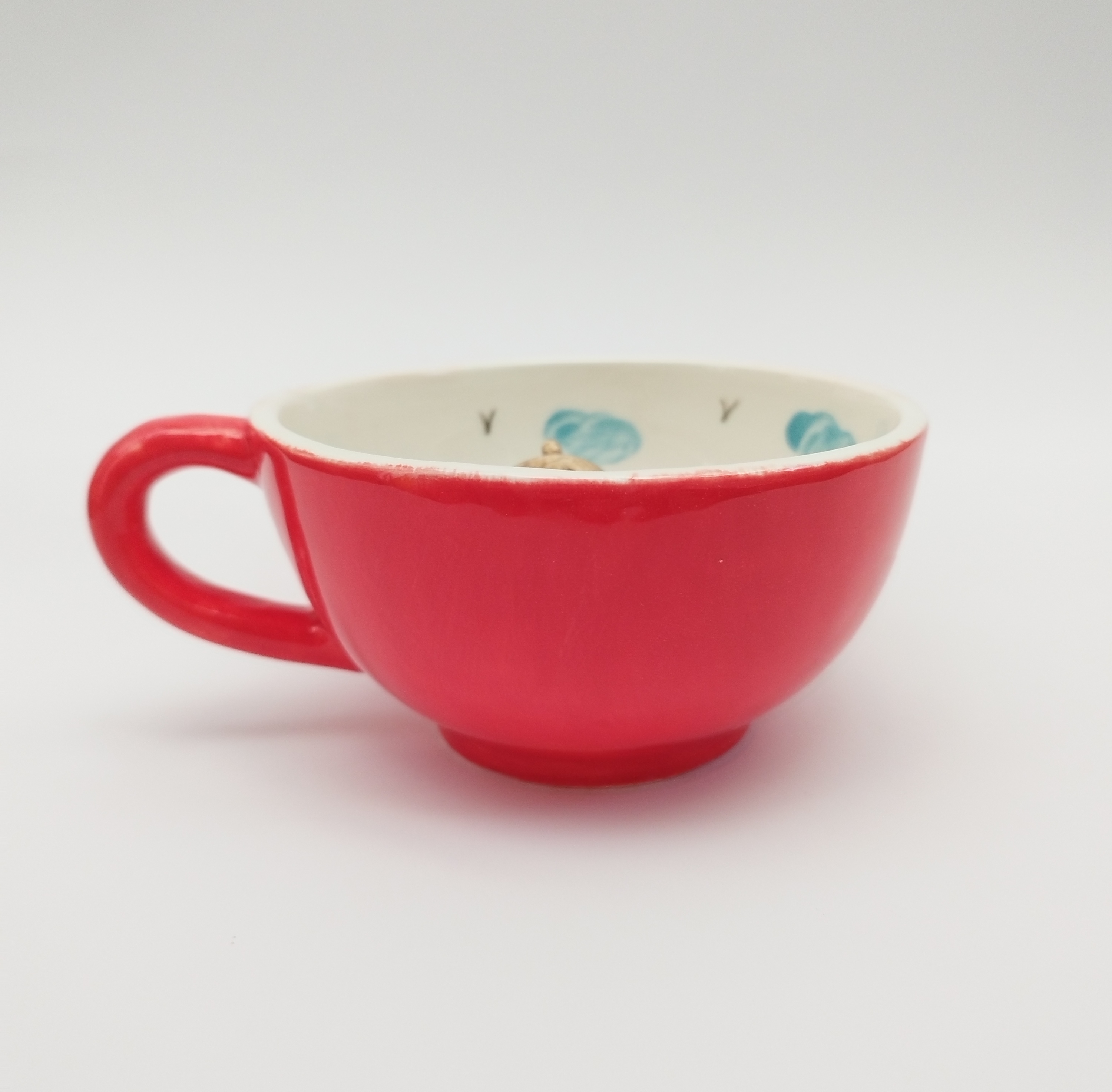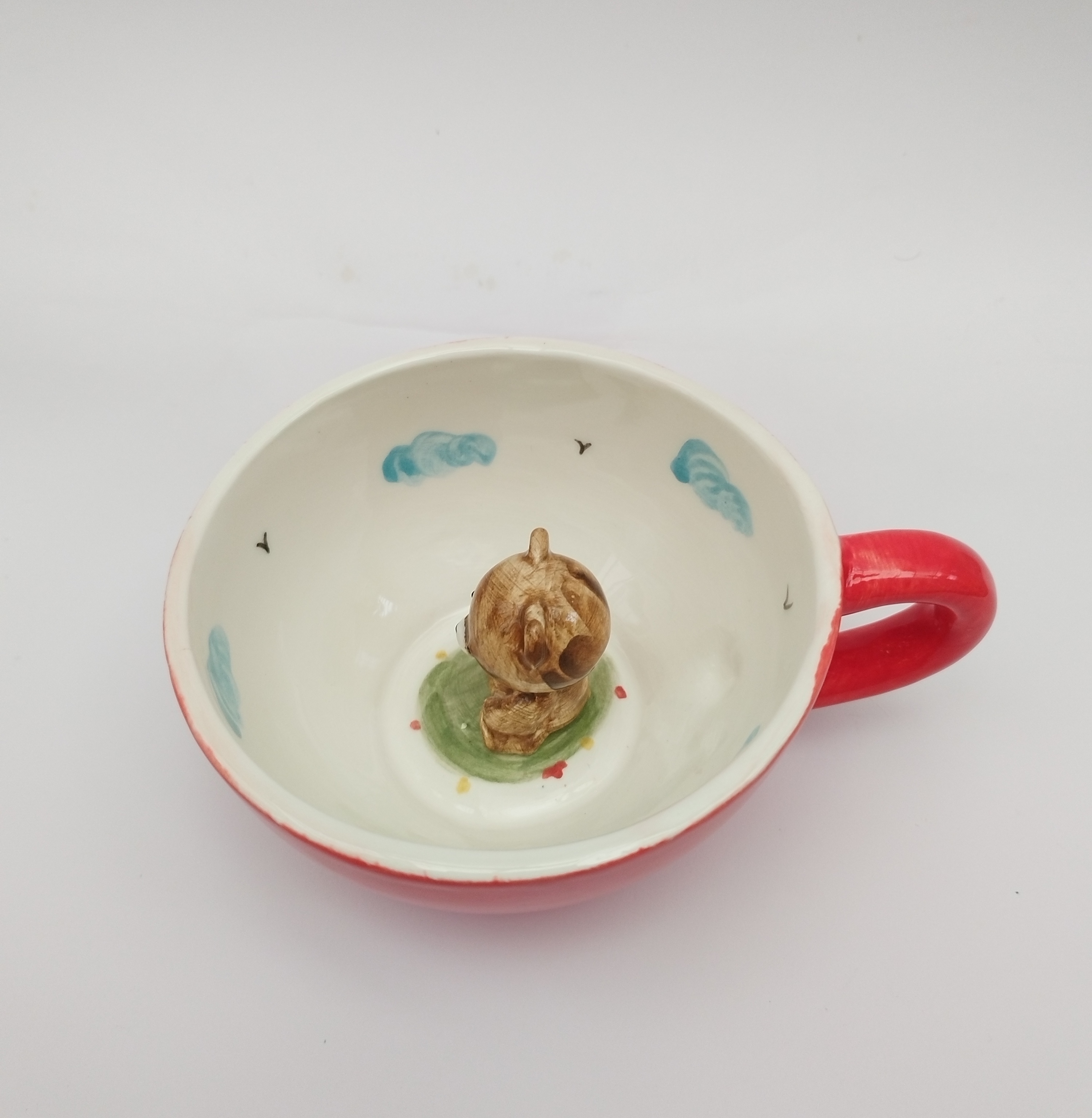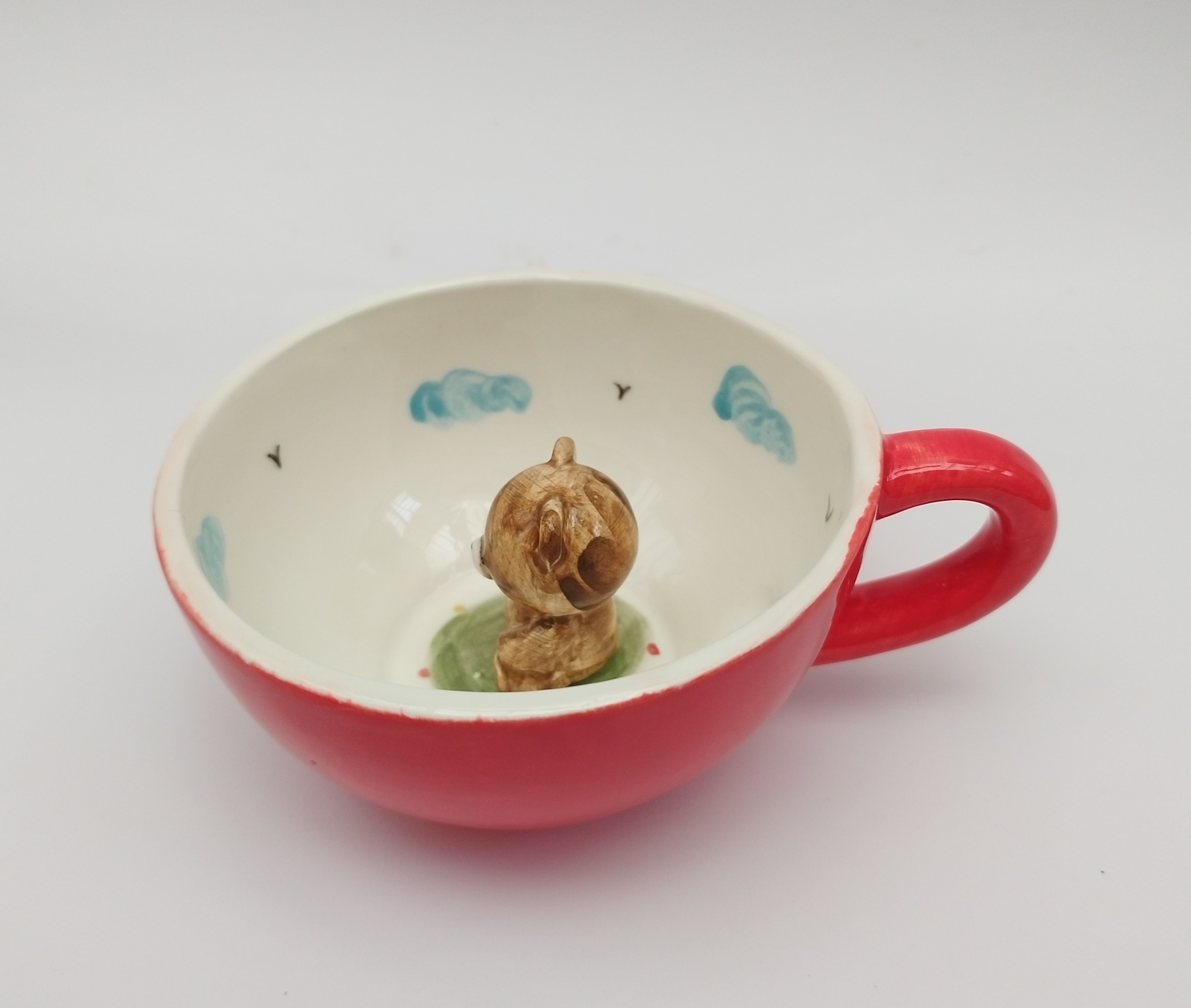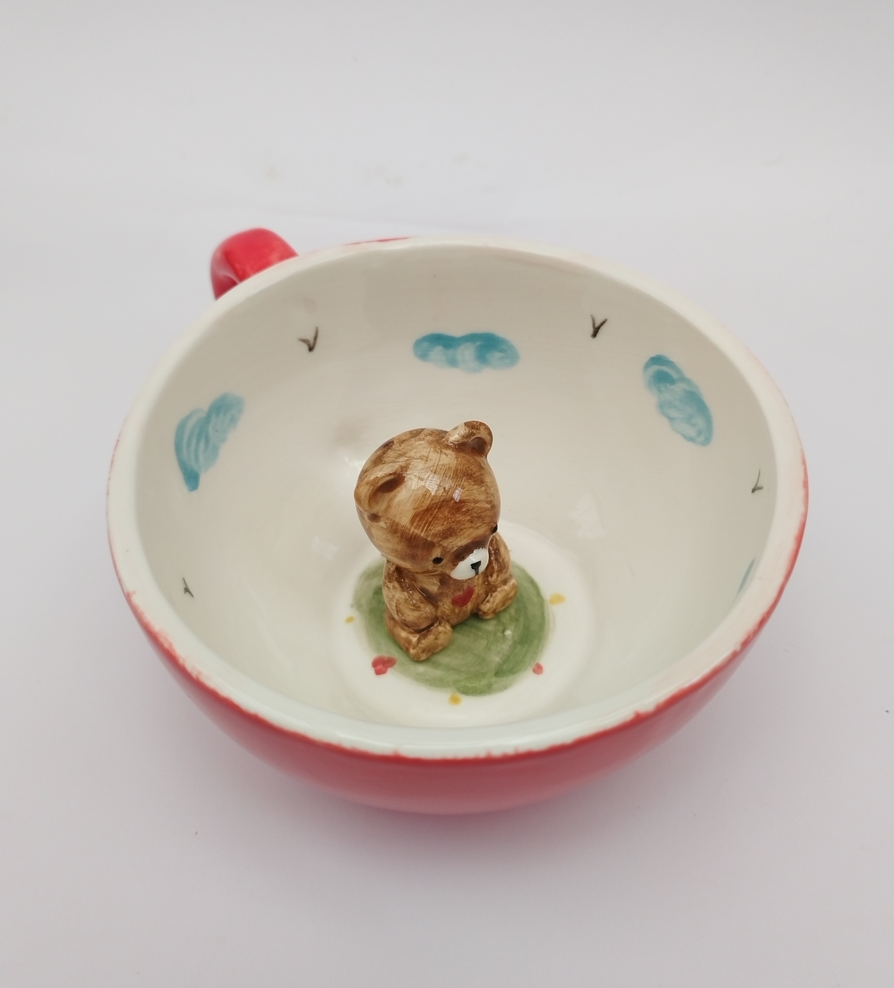 این ماگ زیبا با رنگ قرمز بیرون ماگ و یک خرس کوچک داخل ماگ، حس شادی و عشق را القا میکند.