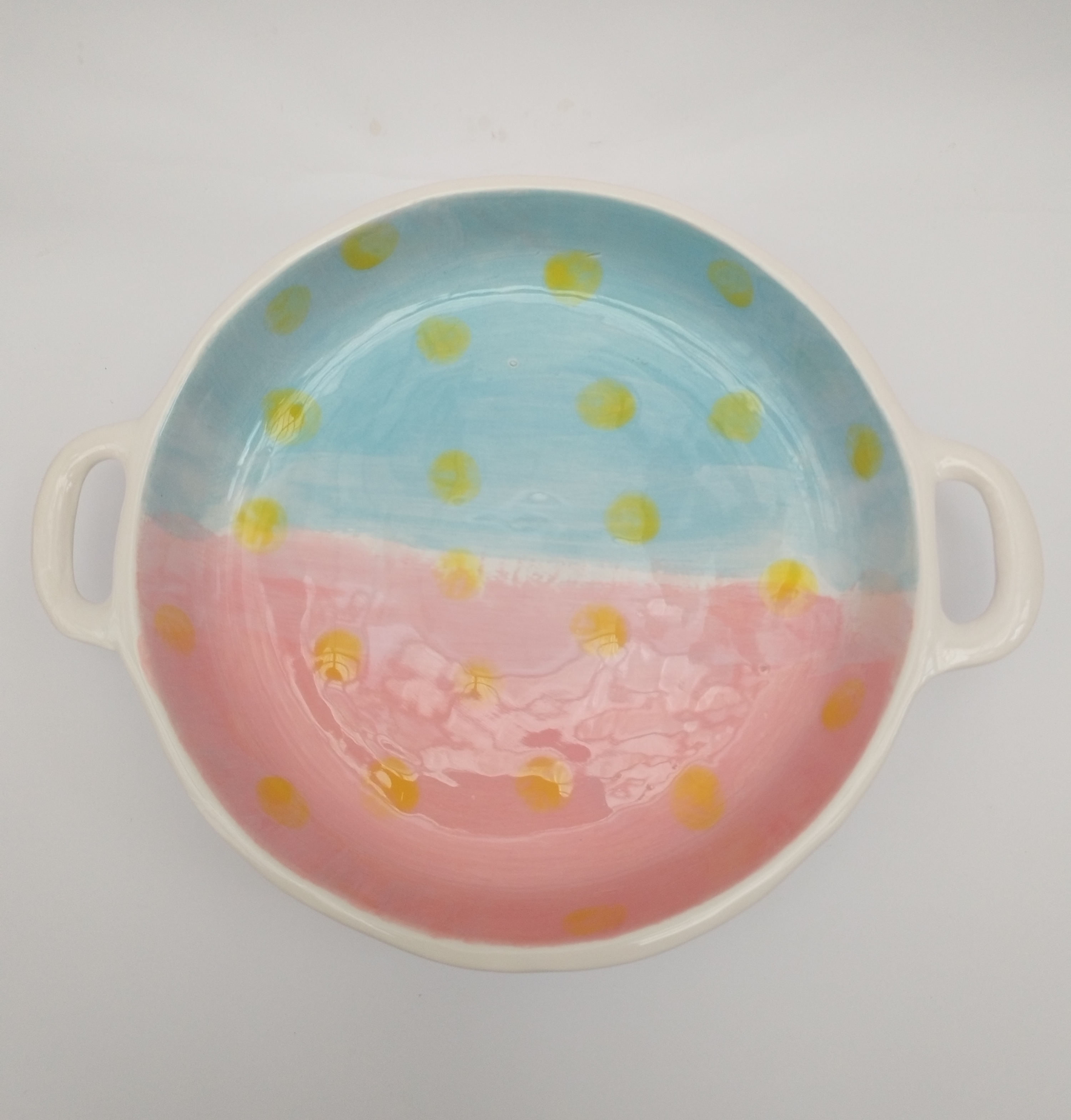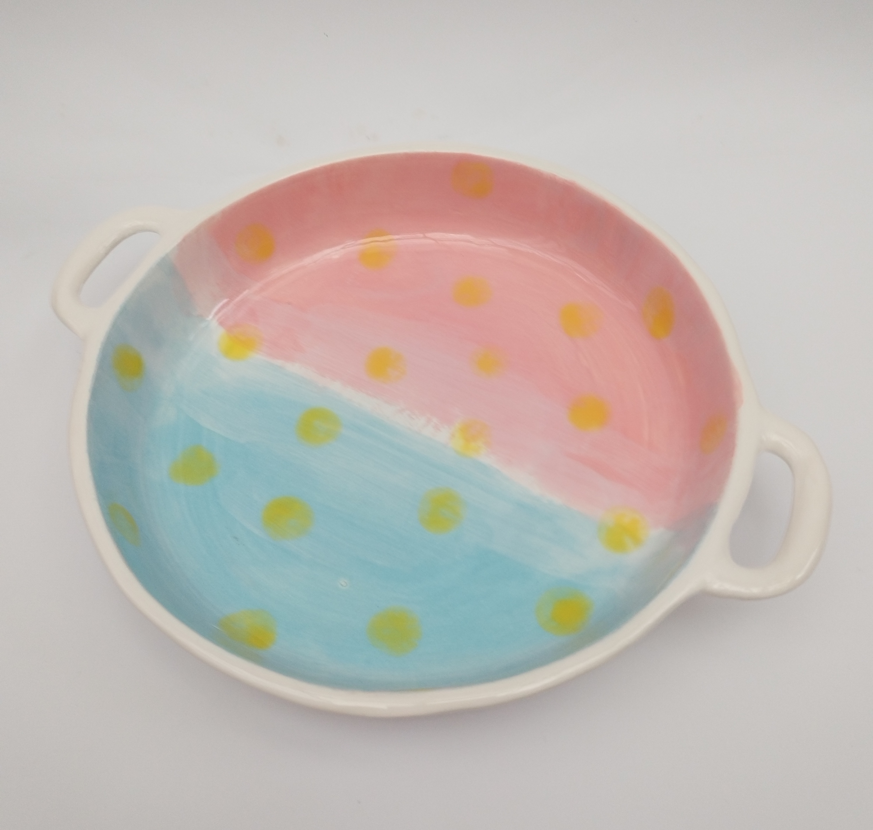 ظرف سرو سرامیکی، تابه سرامیکی دستساز با طرح آبی صورتی و دو دستهی کوچک جانبی، مناسب برای سرو غذا، دسر یا استفاده تزئینی، یا پخت غذا در فر میباشد. دارای لعاب براق و مقاوم در برابر حرارت میباشد. ساختهشده بهصورت کاملاً دستساز و با بهترین متریال. طرح و رنگ صورتی آبی ملایم، این دیس را به انتخابی دوستداشتنی برای میز صبحانه یا عصرانه تبدیل کرده است. ترکیب لطافت رنگ و فرم سنتی، حس صمیمیت و گرمای خانه را زنده میکند.