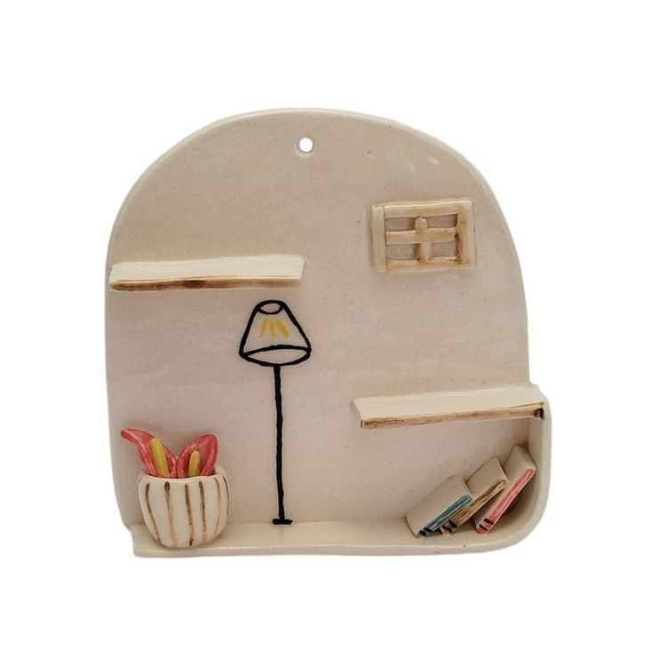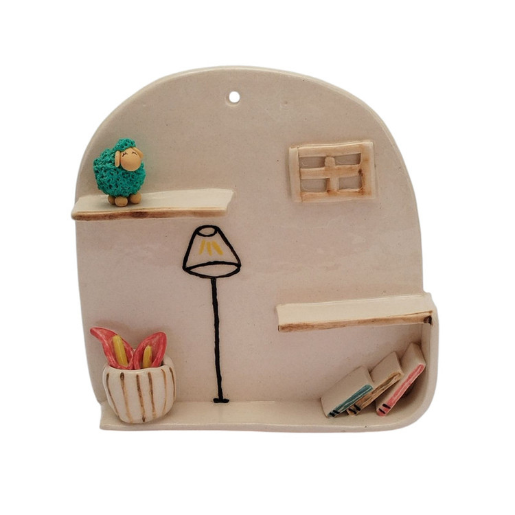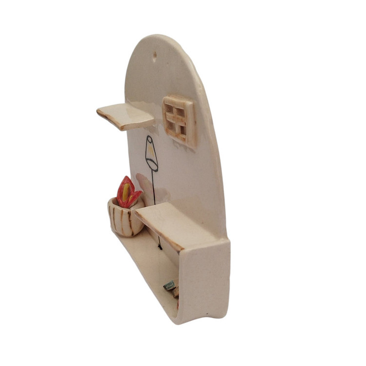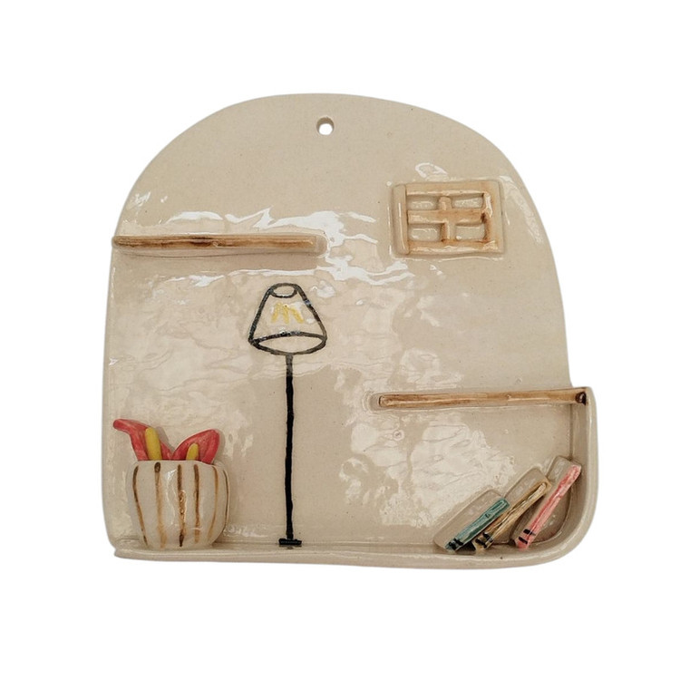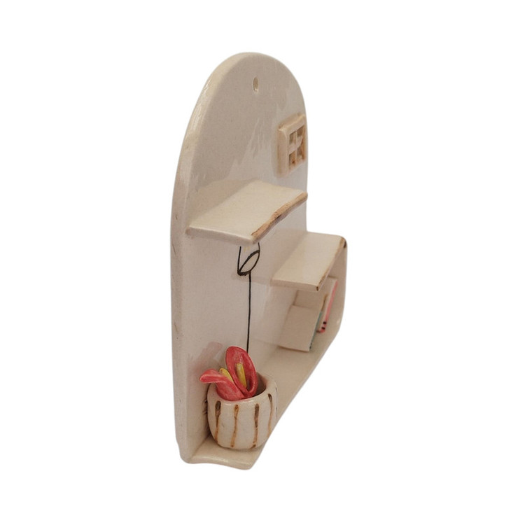 دیوارکوب زیبای سرامیکی دستساز با طرح خانه و جزئیات کوچک مانند گلدان، قفسه و چراغ مناسب برای دکور دیوار اتاق یا آشپزخانه یا هدیه دادن به عزیزانتان میباشد. قابل نصب با قلاب یا میخ کوچک روی دیوار میباشد. ساختهشده با دست و با دقت و ظرافت در جزئیات میباشد. این دیوارکوب کوچک، دنیایی از آرامش در خود دارد. خانهای کوچک و مینیمال که یادآور گرما و سادگی زندگی است. هر جزئیات آن با دست شکل گرفته تا حس حضور در گوشهای از خانهای دنج را تداعی کند.