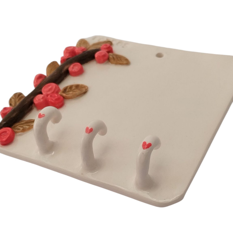 این جاکلیدی دیواری سرامیکی، یک اثر دستساز هنری است که با طراحی ظریف شاخه و گلهای برجسته، جلوهای خاص و متفاوت به فضای منزل شما میبخشد. ترکیب رنگهای گرم (قرمز و قهوهای) در کنار زمینه سفید براق، آن را به گزینهای ایدهآل برای دکوراسیون مینیمال و کلاسیک تبدیل کرده است. این محصول دارای سه عدد قلاب سرامیکی مقاوم با نقوش قلب کوچک است که علاوهبر کارایی برای آویزان کردن کلید، زیبایی بصری هم ایجاد میکند. سوراخ تعبیهشده در قسمت بالای کار نصب آن را روی دیوار بسیار آسان کرده است. این جاکلیدی علاوه بر کاربرد روزمره، میتواند هدیهای خاص و ماندگار برای عزیزانتان باشد.
