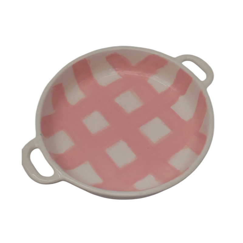 ظرف سرو سرامیکی دستساز با طرح چهارخانهی صورتی و دو دستهی کوچک جانبی، مناسب برای سرو غذا، دسر یا استفاده تزئینی، یا پخت غذا در فر میباشد. دارای لعاب براق و مقاوم در برابر حرارت میباشد. ساختهشده بهصورت کاملاً دستساز و با بهترین متریال. طرح چهارخانهی ساده و رنگ صورتی ملایم، این دیس را به انتخابی دوستداشتنی برای میز صبحانه یا عصرانه تبدیل کرده است. ترکیب لطافت رنگ و فرم سنتی، حس صمیمیت و گرمای خانه را زنده میکند.