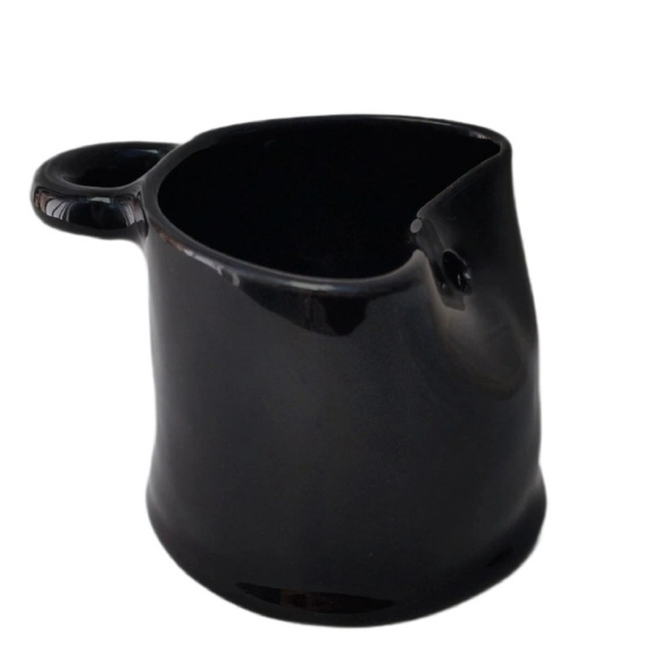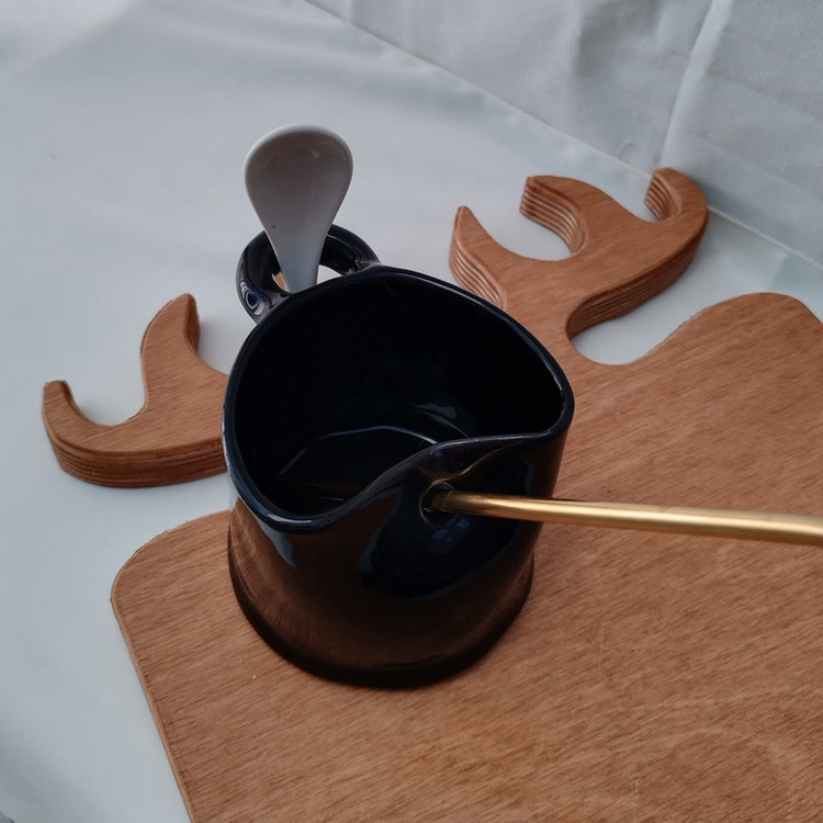 این لیوان سرامیکی زیبا ساخت دست میباشد و به صورت دفرمه میباشد. دارای یک حلقه برای نگهداری قاشق و دارای یک سوراخ برای نی میباشد. لعاب مشکی براق این اثر را خاص و چشم نواز میکند. این اثر تک نسخه میباشد.