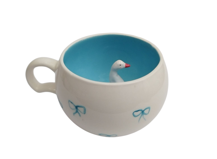 این ماگ زیبا و خلاقانه از جنس سرامیک باکیفیت ساخته شده و طراحی منحصربهفرد آن شامل یک فیگور غاز سهبعدی در داخل ماگ است که هنگام نوشیدن، شما را غافلگیر میکند. رنگ آبی آسمانی داخل ماگ همراه با نقاشی دستی پاپیون آبی در بیرون ماگ، حس شادی و لطافت را القا میکند.