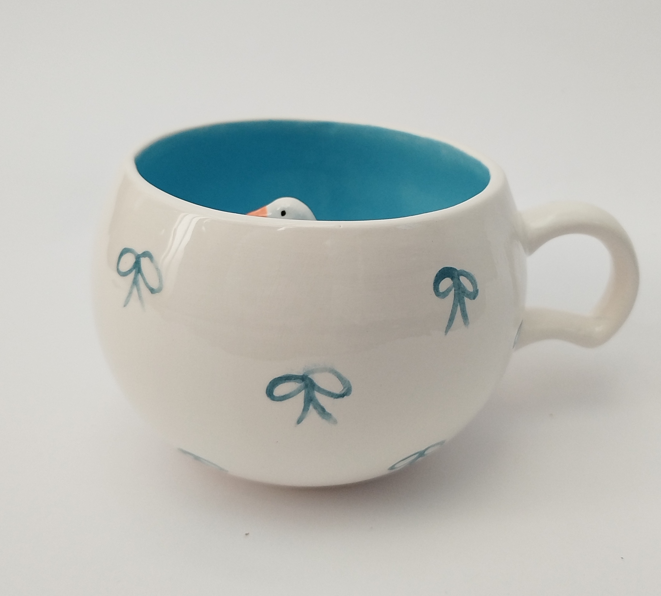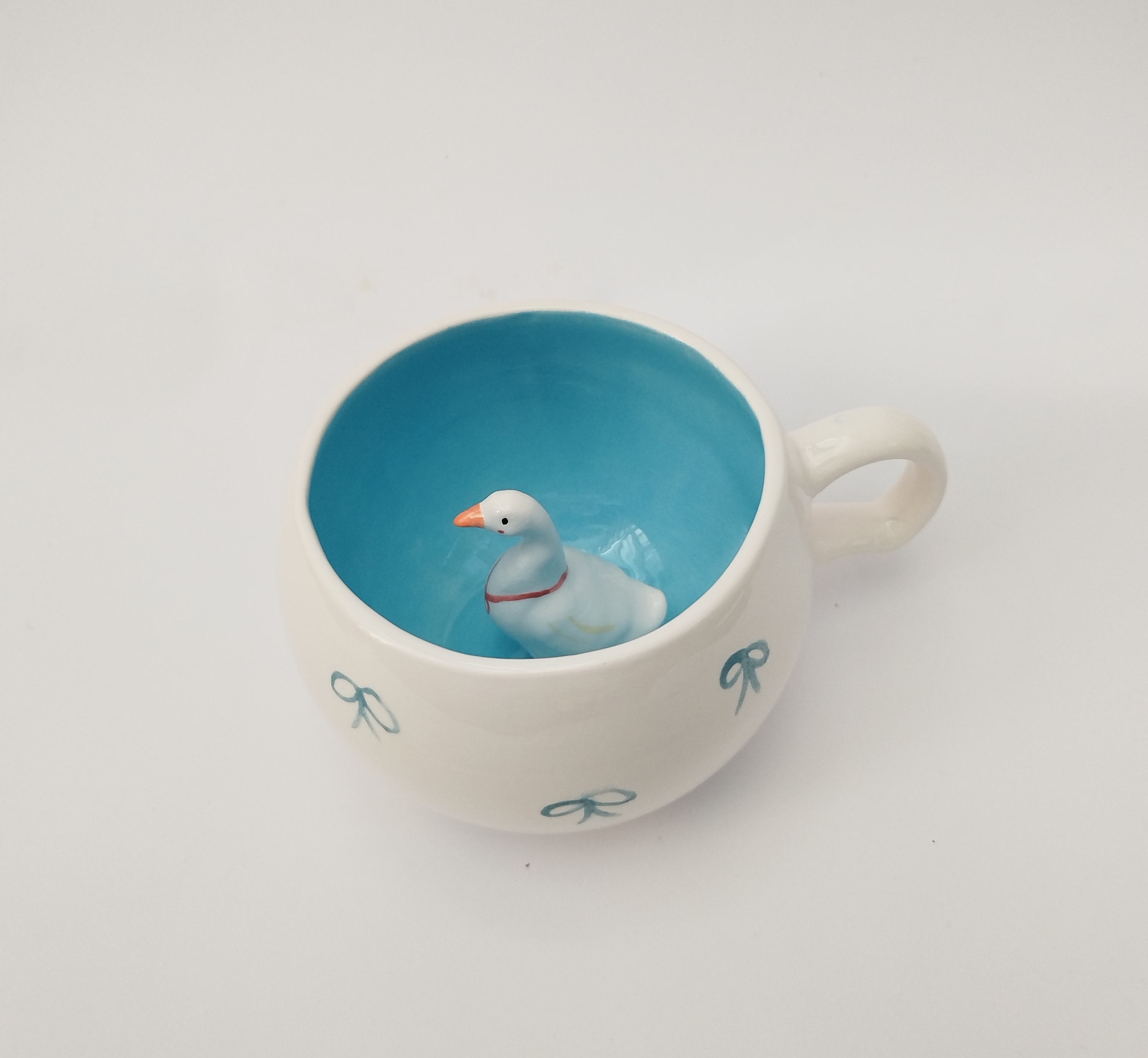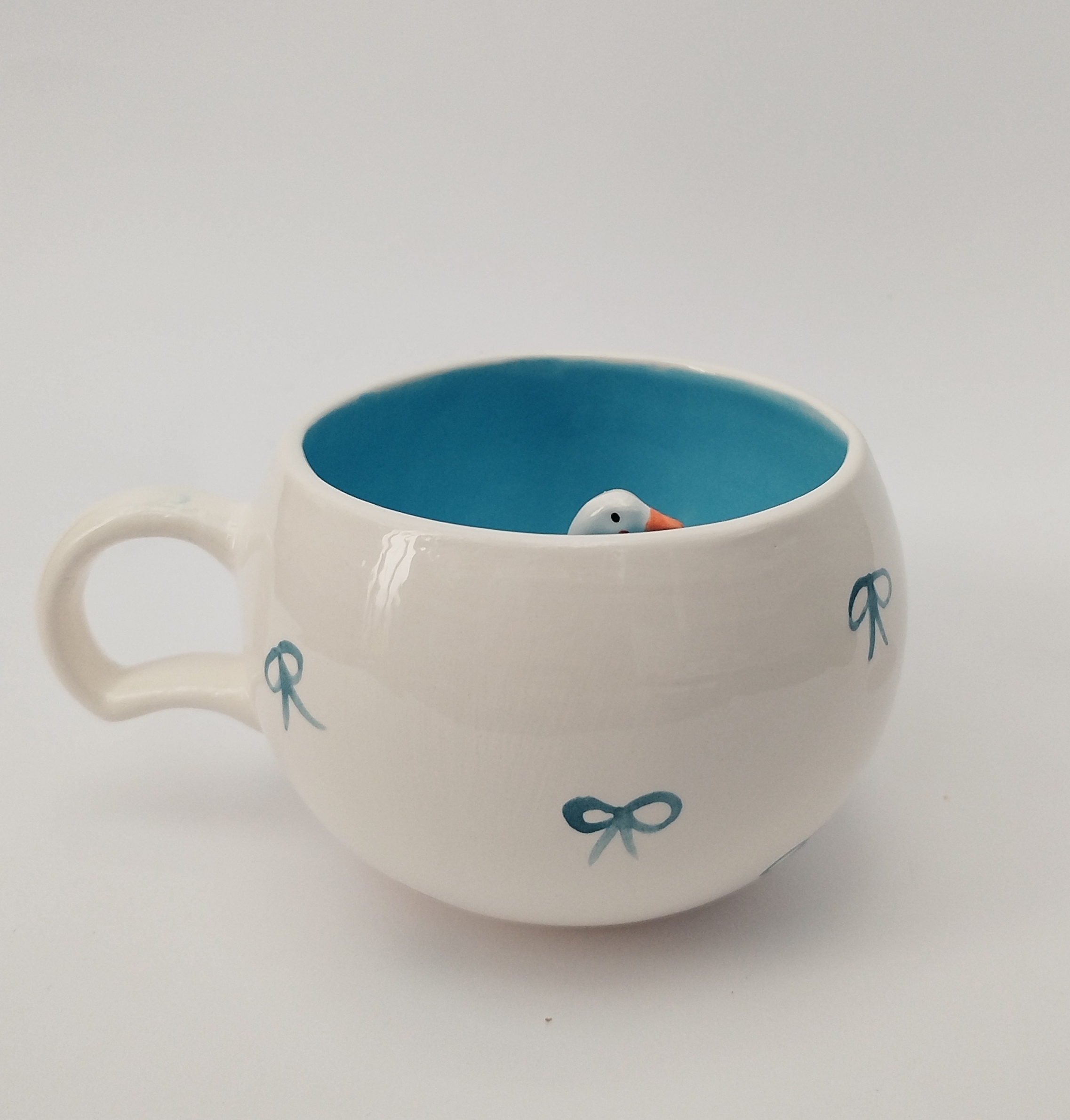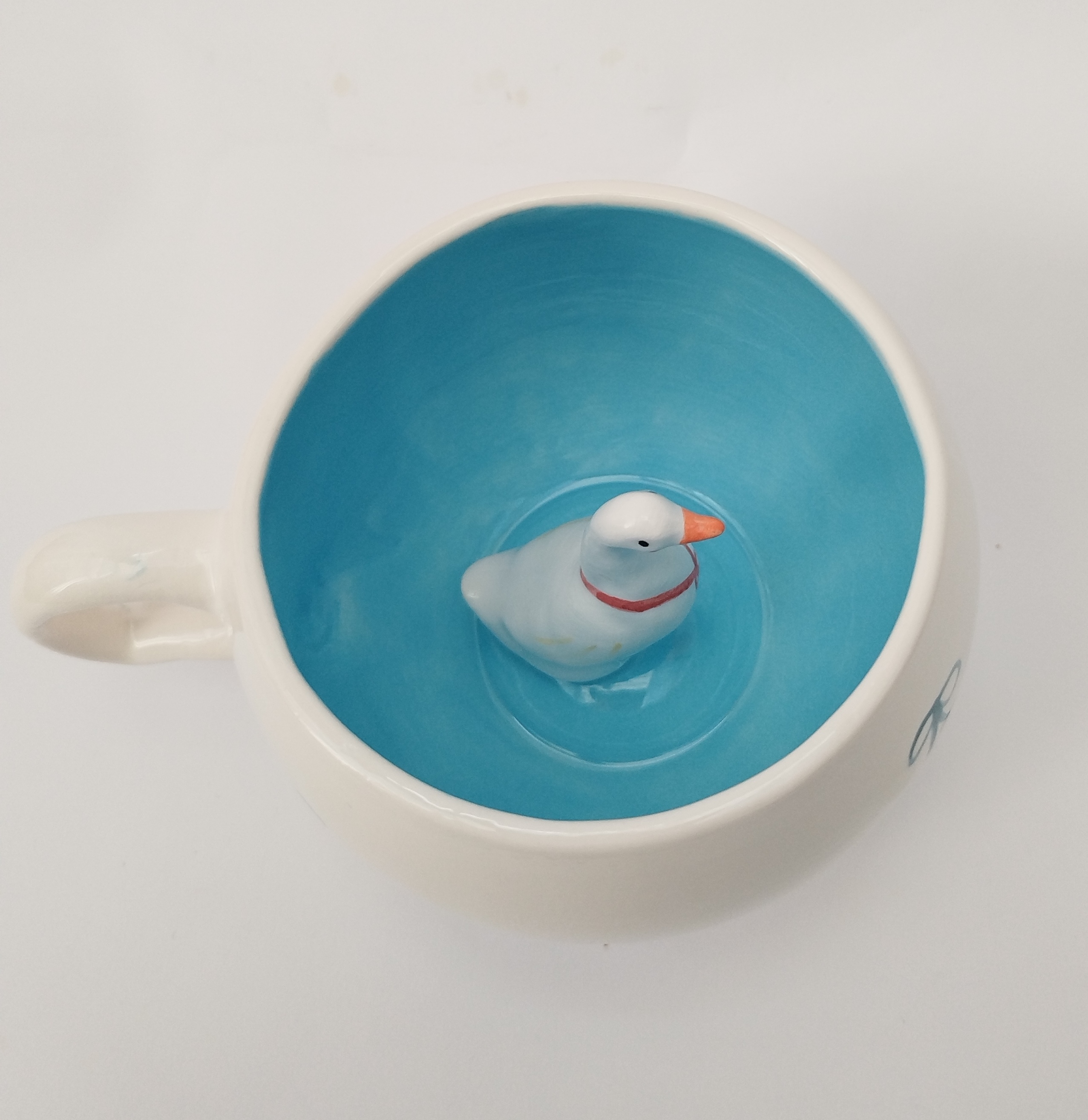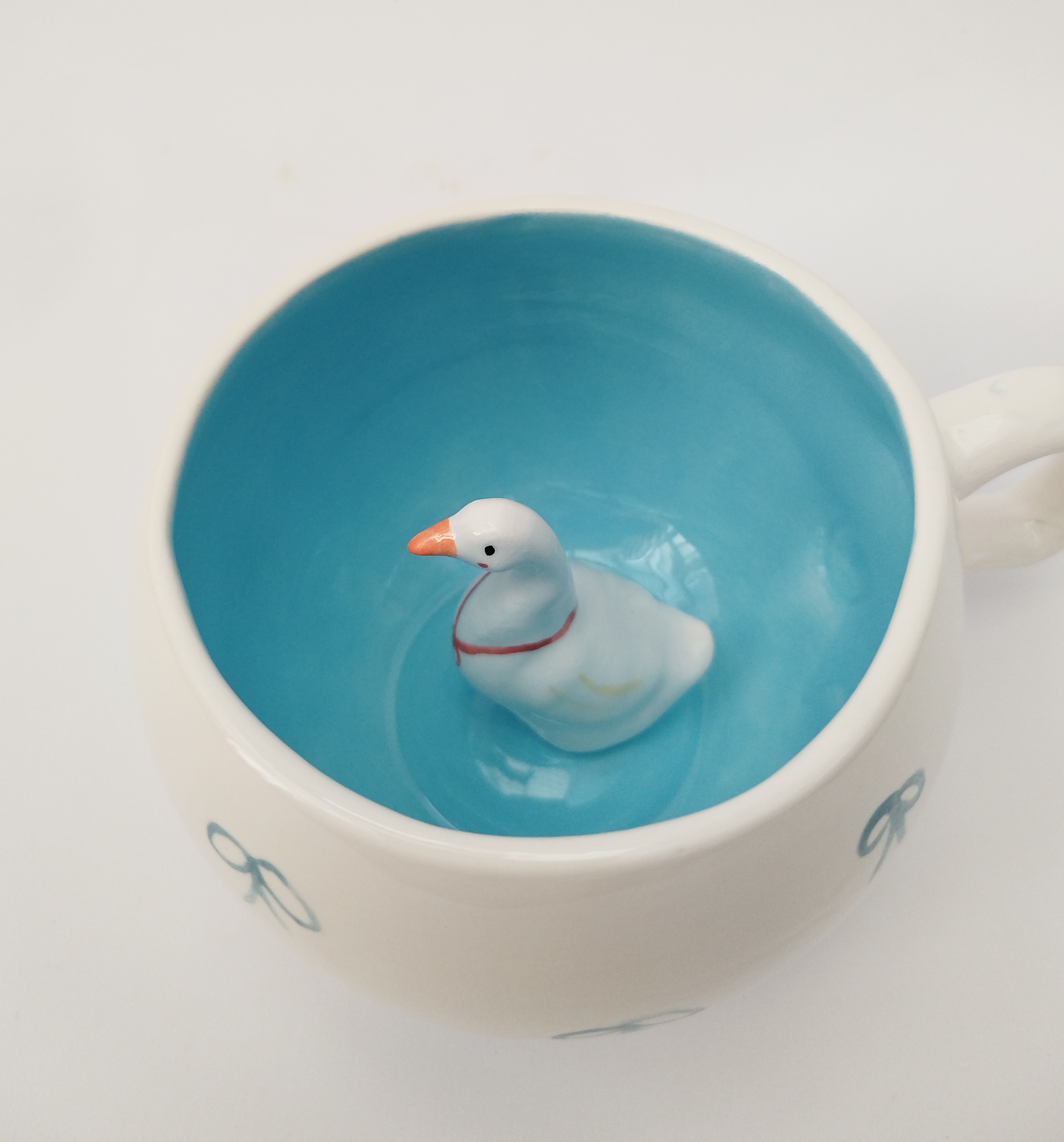 این ماگ زیبا و خلاقانه از جنس سرامیک باکیفیت ساخته شده و طراحی منحصربهفرد آن شامل یک فیگور غاز سهبعدی در داخل ماگ است که هنگام نوشیدن، شما را غافلگیر میکند. رنگ آبی آسمانی داخل ماگ همراه با نقاشی دستی پاپیون آبی در بیرون ماگ، حس شادی و لطافت را القا میکند.
