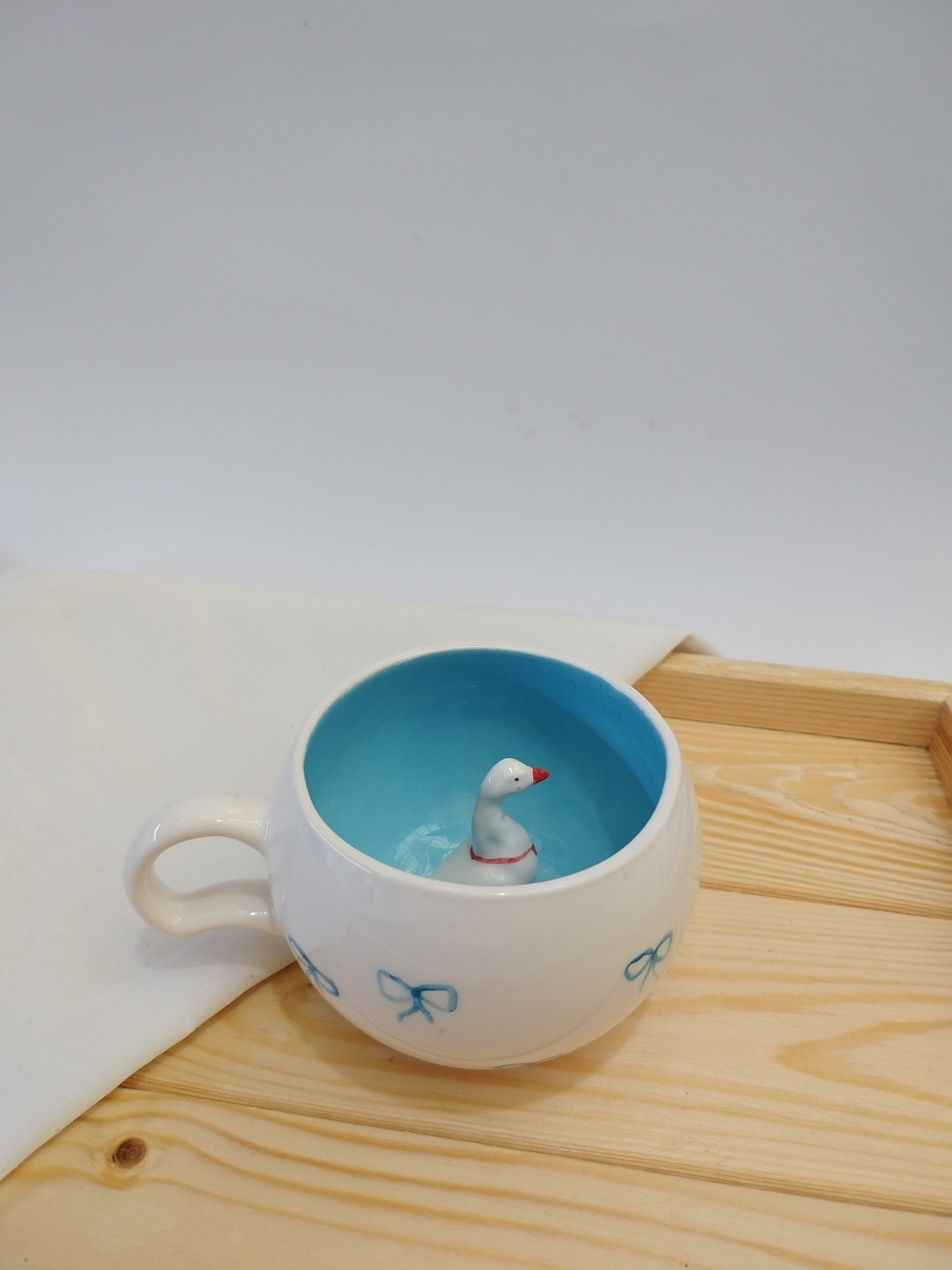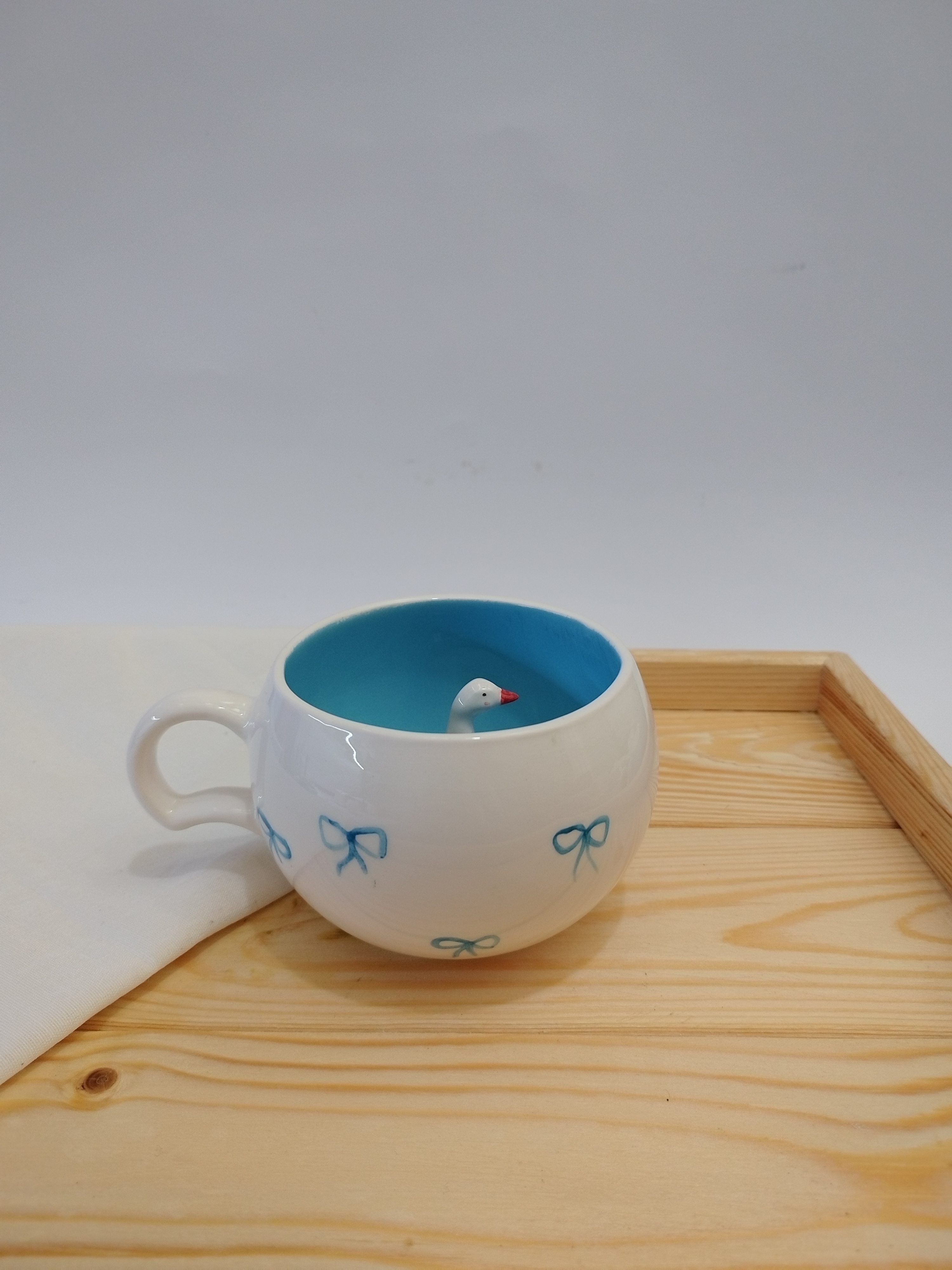 این ماگ زیبا و خلاقانه از جنس سرامیک باکیفیت ساخته شده و طراحی منحصربهفرد آن شامل یک فیگور غاز سهبعدی در داخل ماگ است که هنگام نوشیدن، شما را غافلگیر میکند. رنگ آبی آسمانی داخل ماگ همراه با نقاشی دستی پاپیون آبی در بیرون ماگ، حس شادی و لطافت را القا میکند.