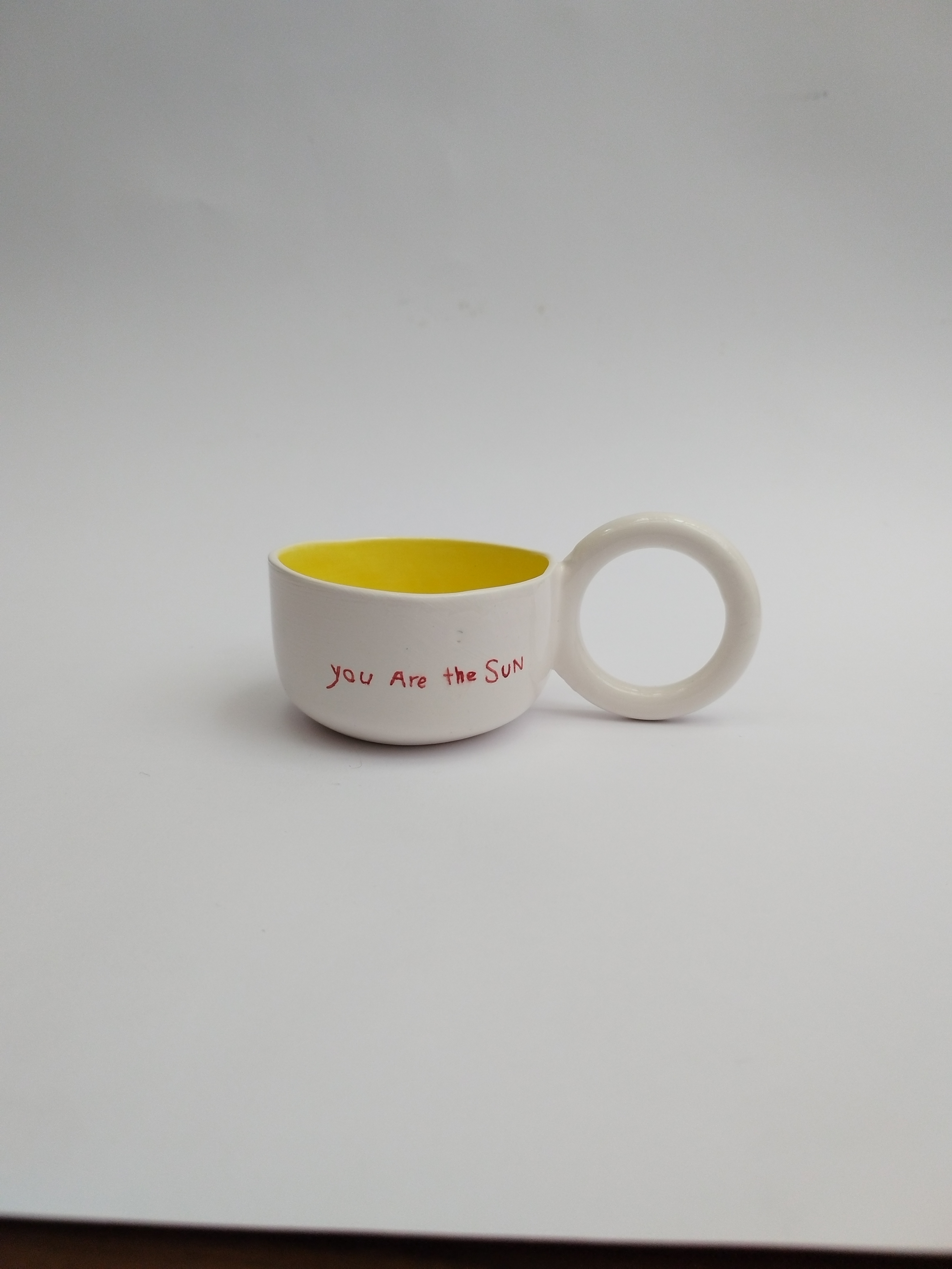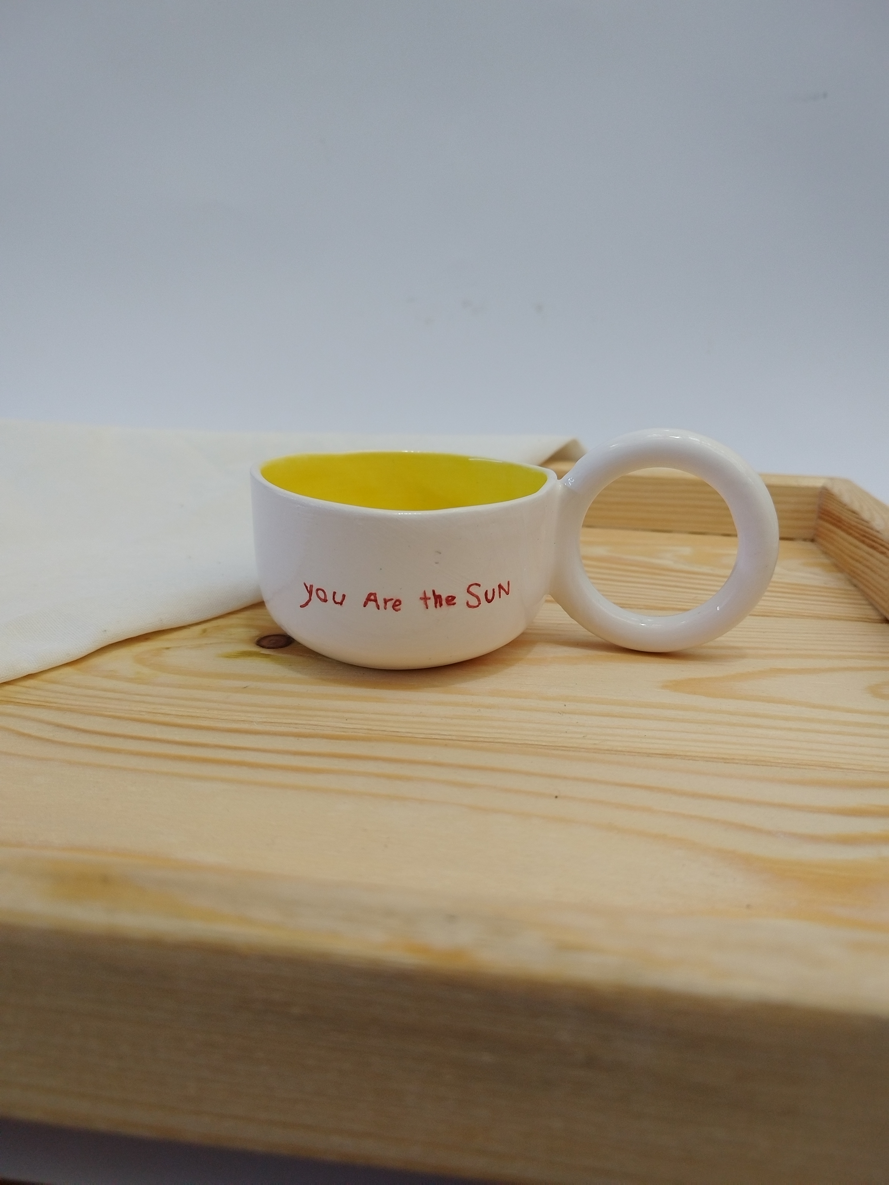 رنگ زرد داخل فنجان و طرح خورشید در یک طرف و نوشته "you are the sun" در طرف دیگر، این فنجان را به یک اثر هنری و هدیه مناسب برای عزیزان تبدیل میکند.