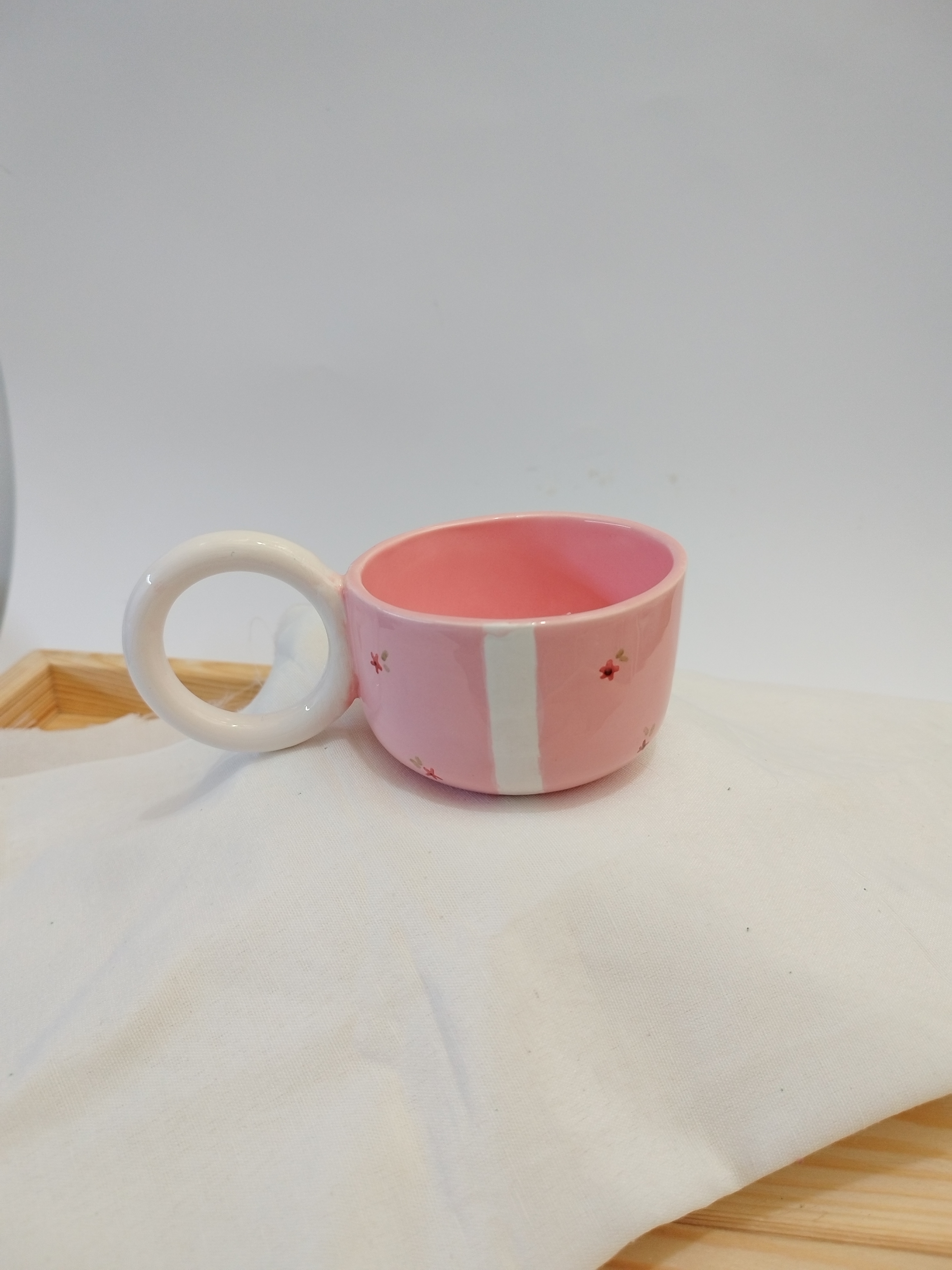 این فنجان سرامیکی دستساز با ترکیب رنگ صورتی ملایم و خطوط ظریف، انتخابی دوستداشتنی برای لحظههای آرام نوشیدن قهوه یا چای است. طراحی مینیمال اما گرم آن، حس لطافت و سادگی را همزمان منتقل میکند. هر فنجان بهصورت کاملاً دستی ساخته شده و همین موضوع باعث میشود هیچ دو نمونهای دقیقاً شبیه هم نباشند؛ ویژگیای که ارزش هنری آن را دوچندان میکند.